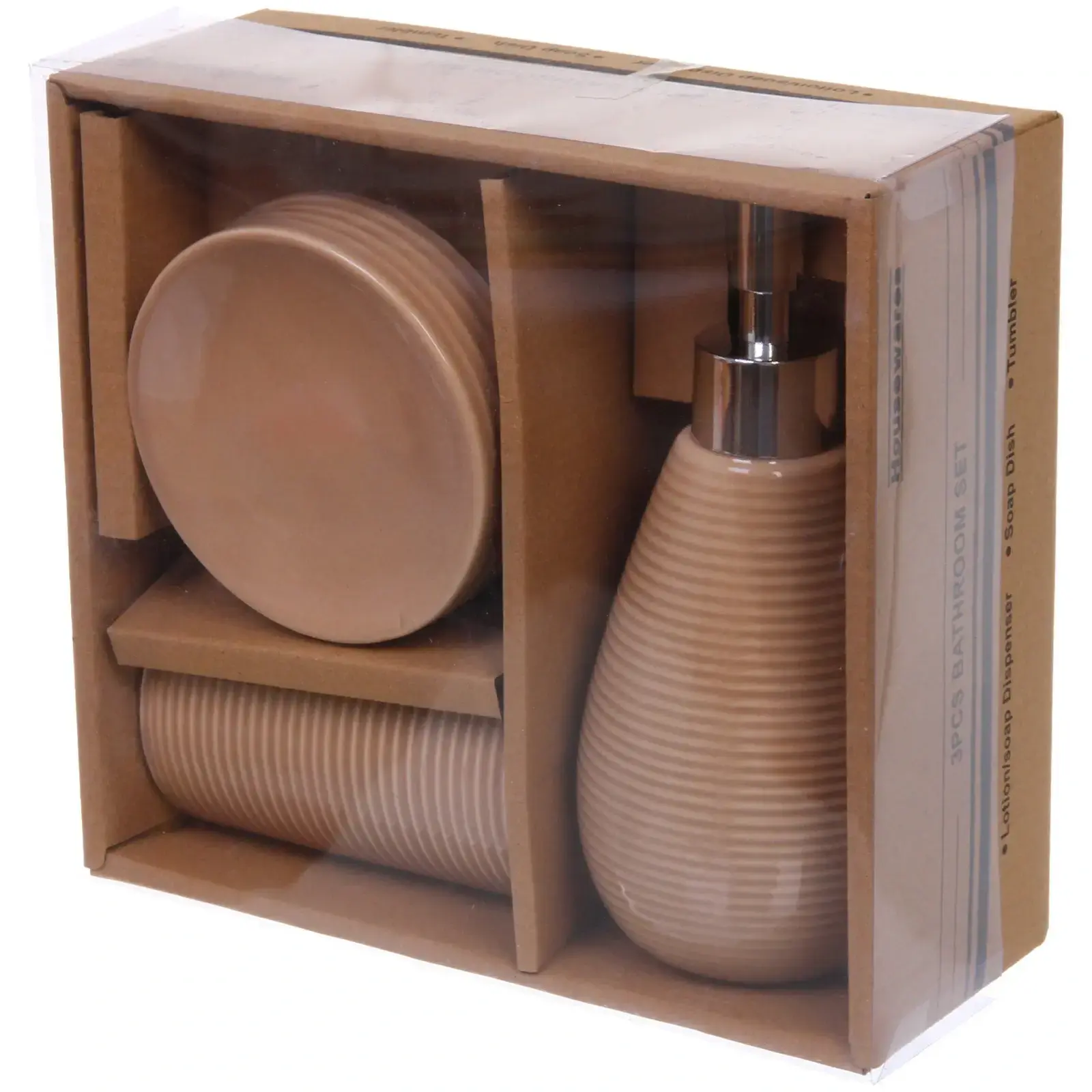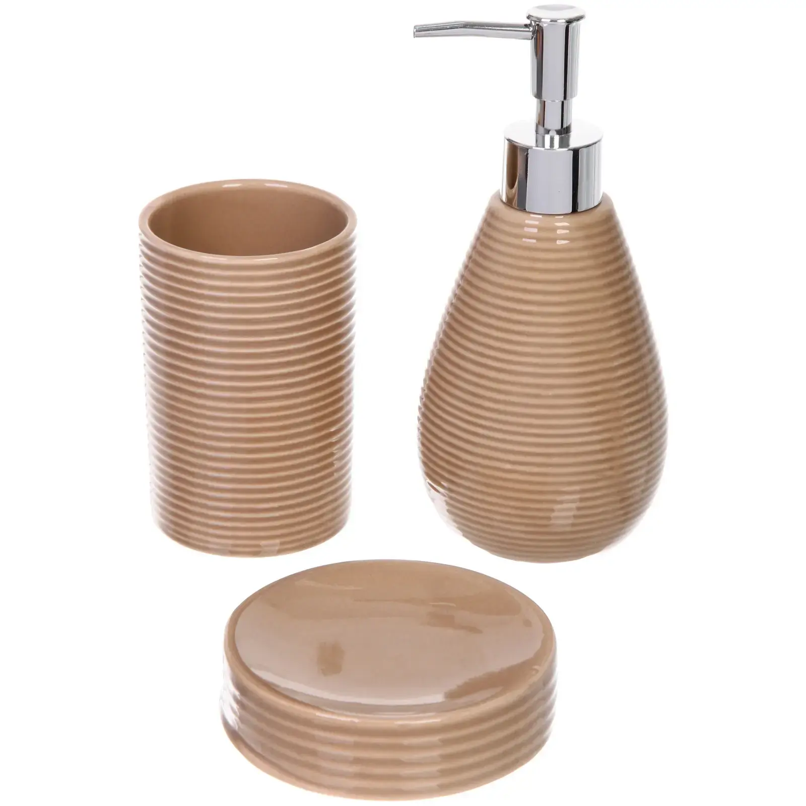 Каждый элемент набора имеет продуманный дизайн: дозатор для мыла выполнен в каплевидной форме с металлическим насосом, стакан имеет рифленую поверхность для удобства использования, а мыльница обладает круглой формой, что добавляет изюминку в общий вид. Размеры предметов идеально подходят для стандартных ванных комнат, а их стильный внешний вид будет радовать вас каждый день.