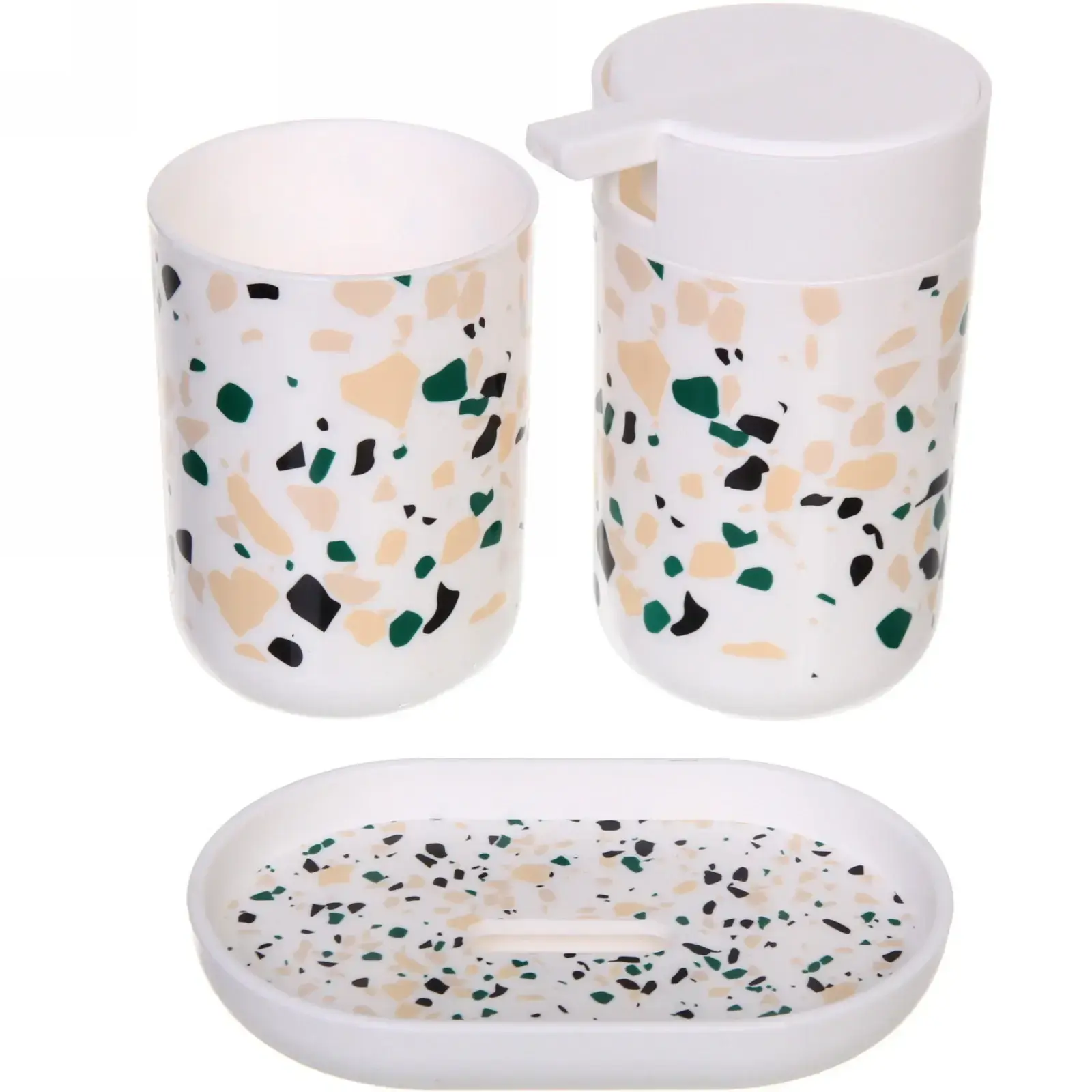 Преобразите вашу ванную комнату с набором для ванной «Персея», который сочетает в себе элегантный дизайн и практичность. Этот набор из трех предметов включает мыльницу, дозатор для жидкого мыла и стакан для зубных щеток, что делает его идеальным решением для хранения ваших принадлежностей. Благодаря высококачественному пластику, изделия устойчивы к резким перепадам температуры и высокой влажности, что гарантирует их долговечность и надежность.