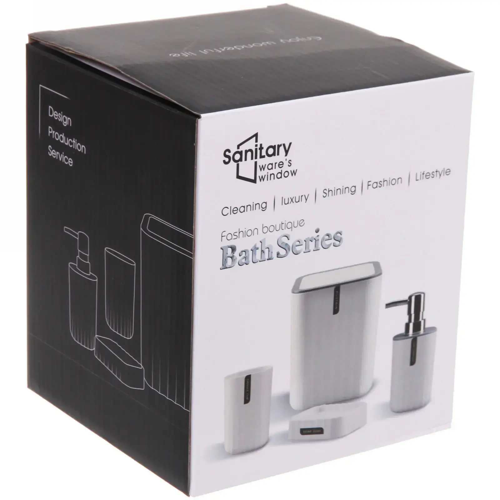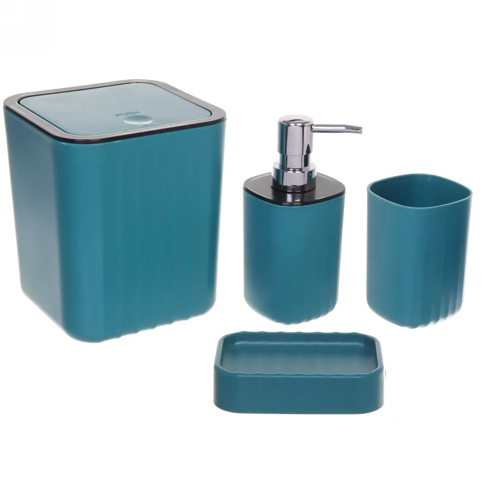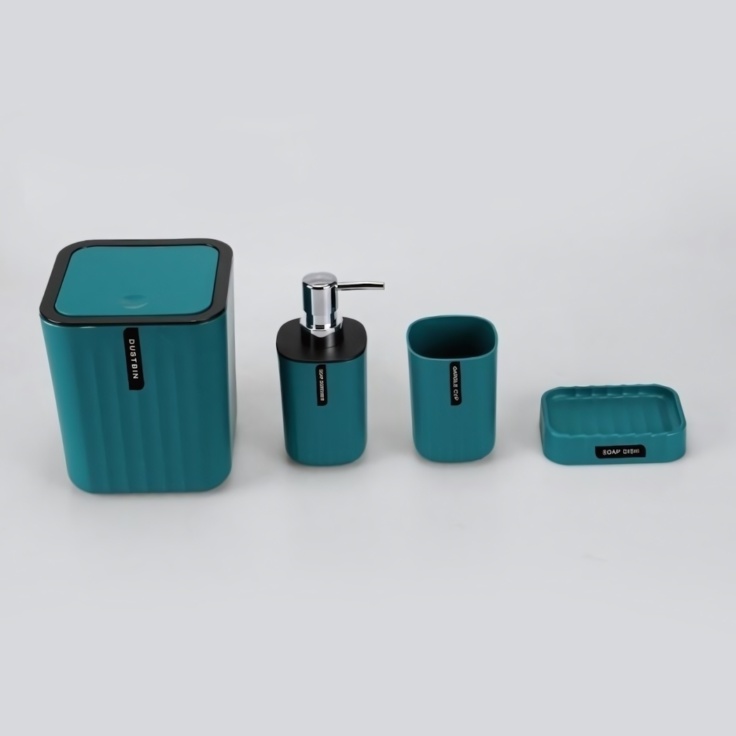 В набор входят: контейнер с крышкой, дозатор для мыла, стакан для зубных щеток и мыльница. Все предметы выполнены из качественного пластика, что обеспечивает их долговечность и легкость в уходе. Набор подходит для использования в ванной комнате, туалете или на кухне, помогая организовать пространство и поддерживать порядок.