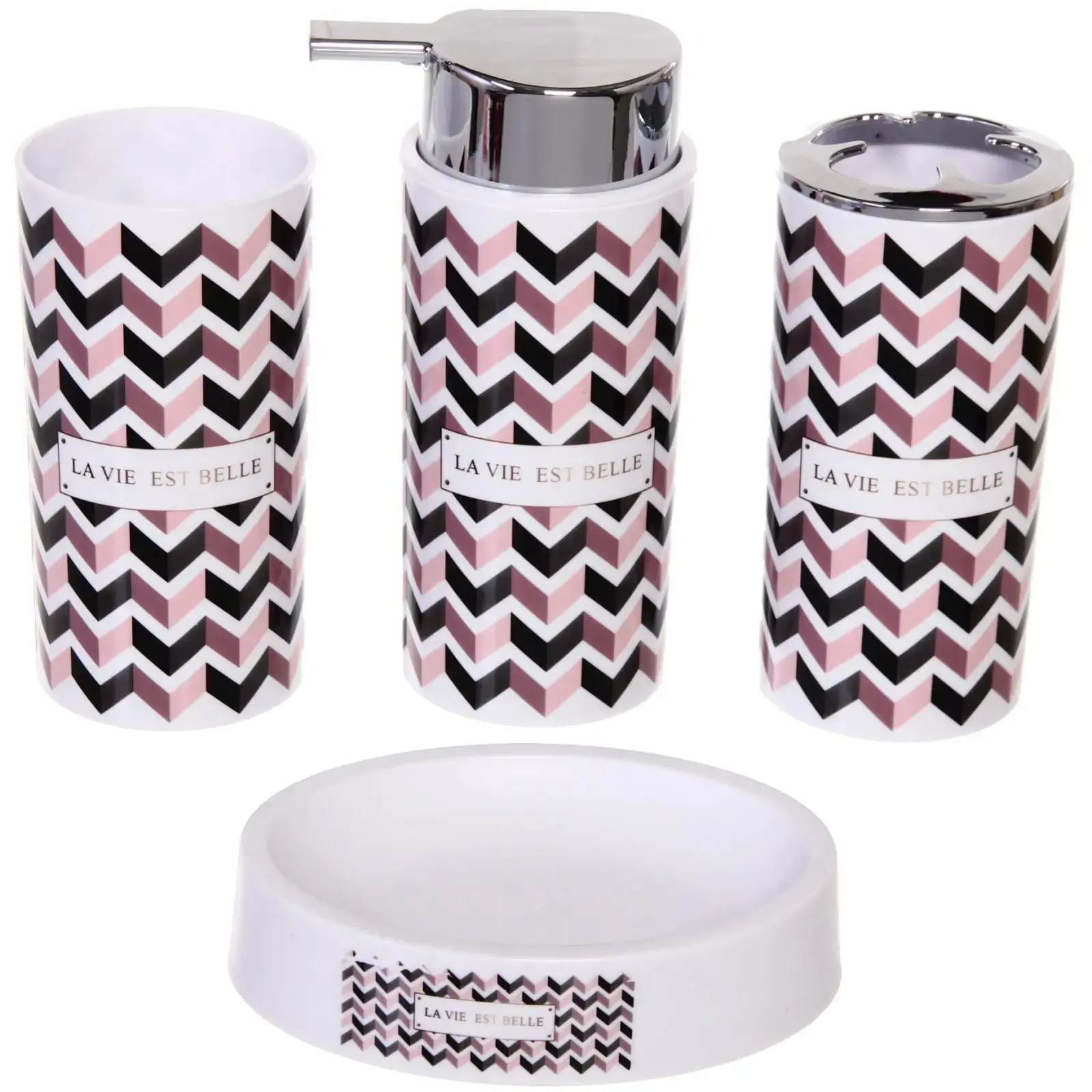 Набор из 4 предметов с гармоничным дизайном создаст атмосферу уюта и порядка. Зигзагообразный узор в контрастной черно-розовой гамме добавит интерьеру динамики, а продуманная комплектация поможет организовать пространство.
