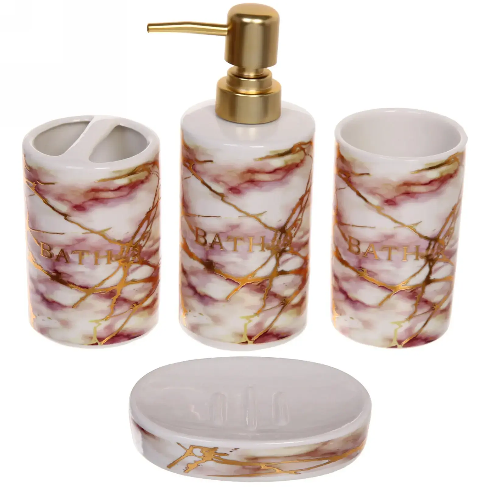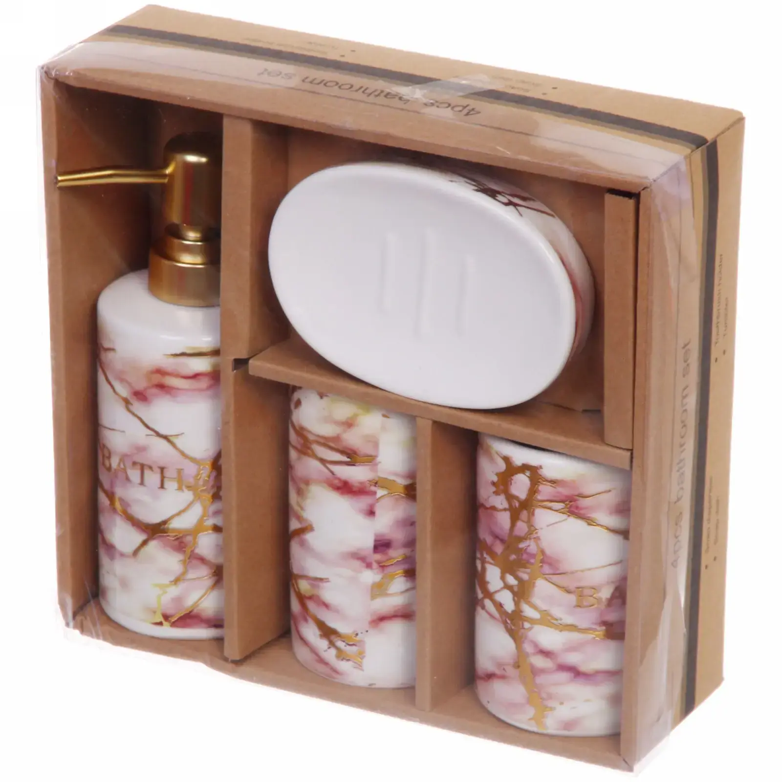 Набор из 4 керамических аксессуаров с золотым декором создаст атмосферу роскоши и упорядочит ваши гигиенические принадлежности. Мраморный рисунок с розовыми переливами гармонично сочетается с любой современной сантехникой и интерьерными решениями.