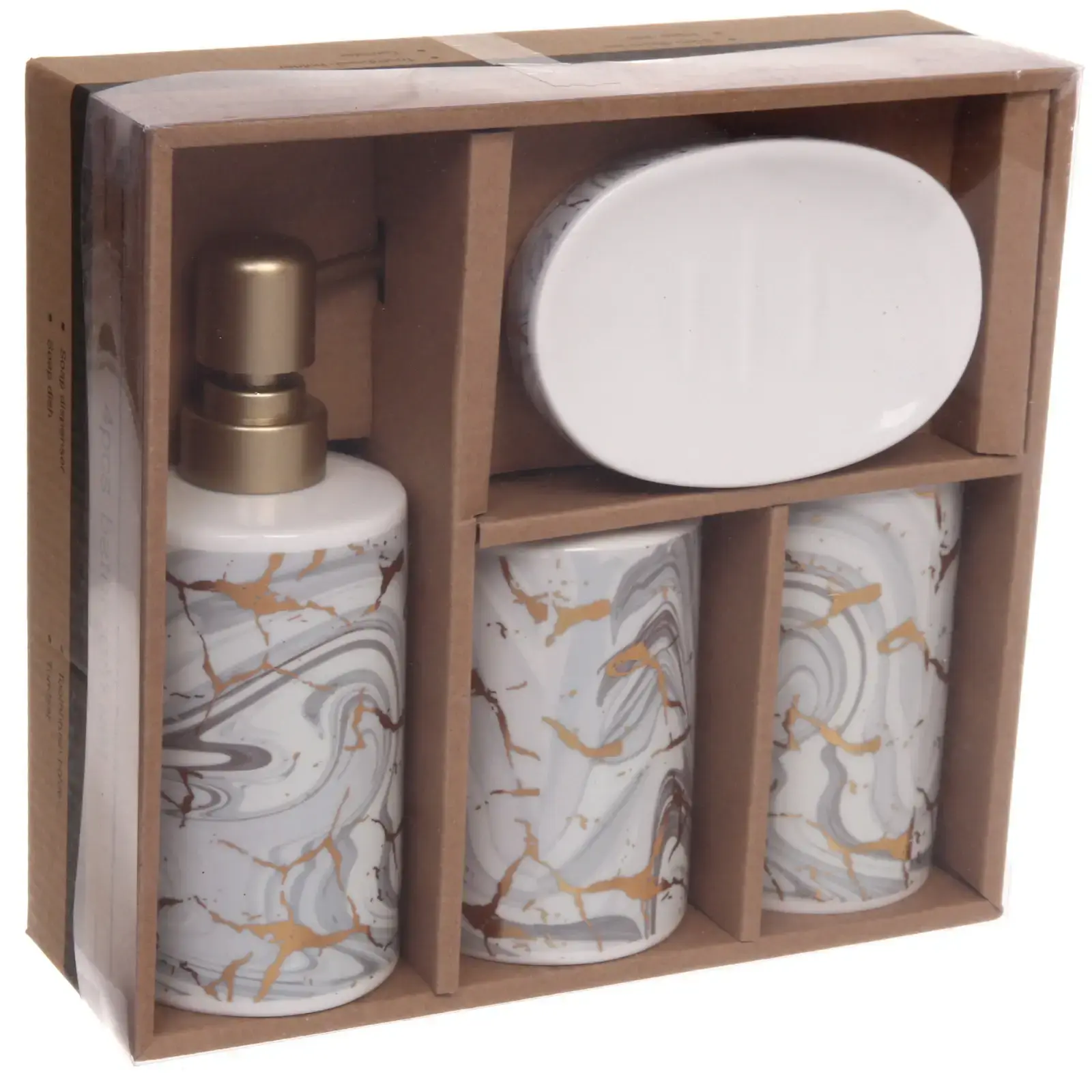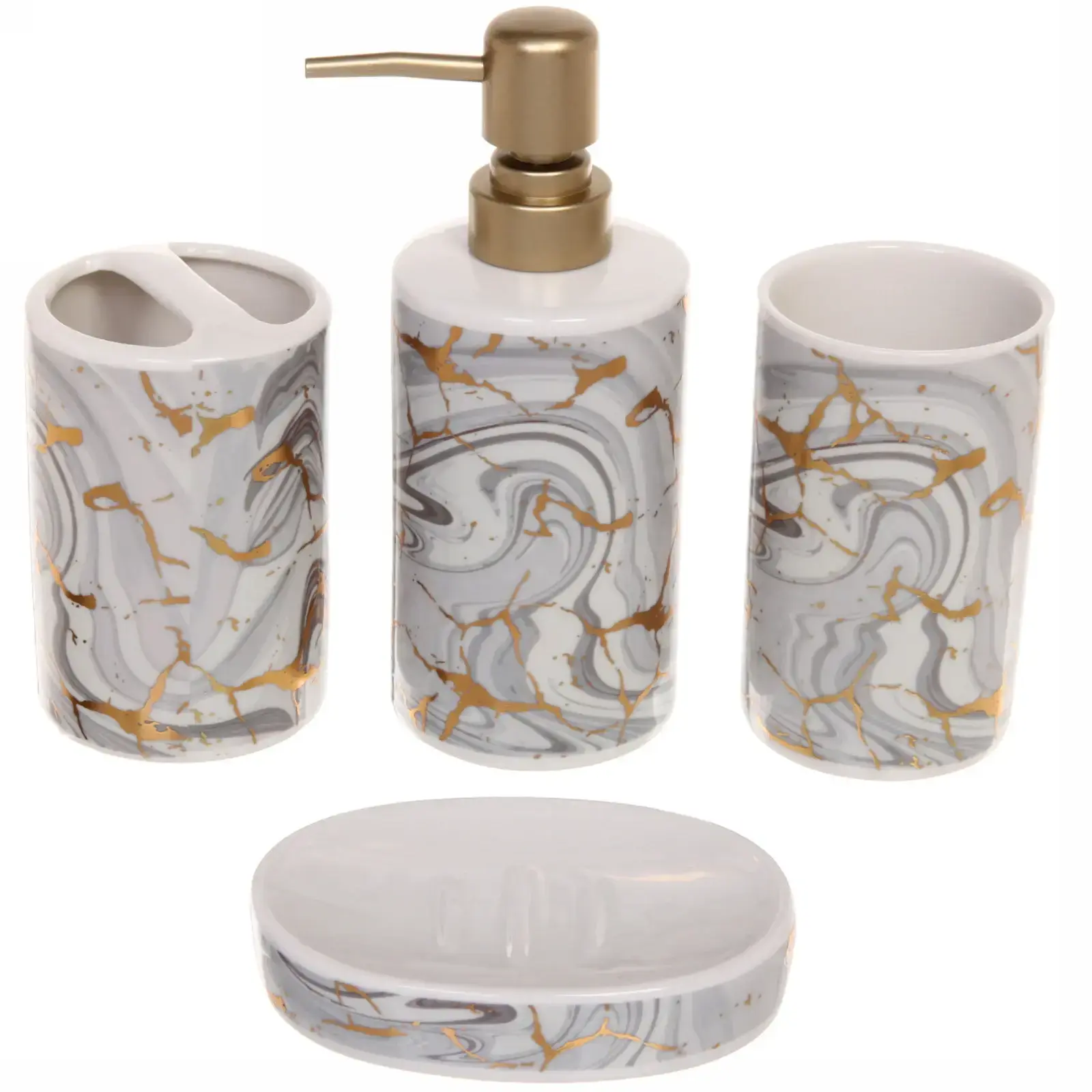 Керамический набор «Петра» сочетает функциональность и изысканный дизайн — ваши аксессуары станут гармоничным дополнением интерьера. Мраморный узор с золотыми акцентами создаёт атмосферу роскоши, а продуманная комплектация избавит от необходимости покупать предметы по отдельности.