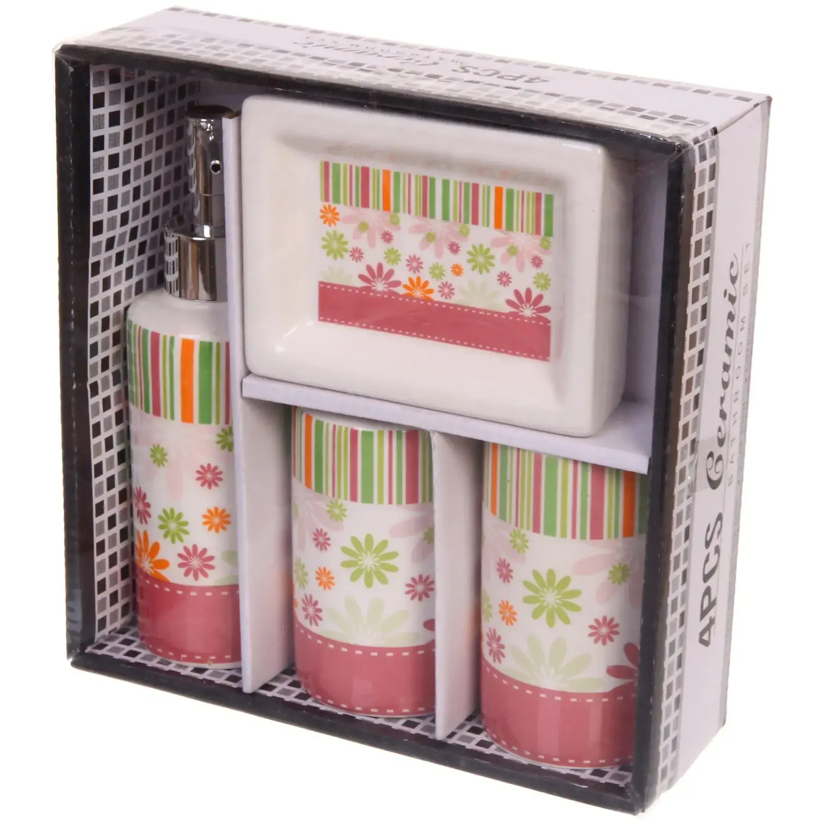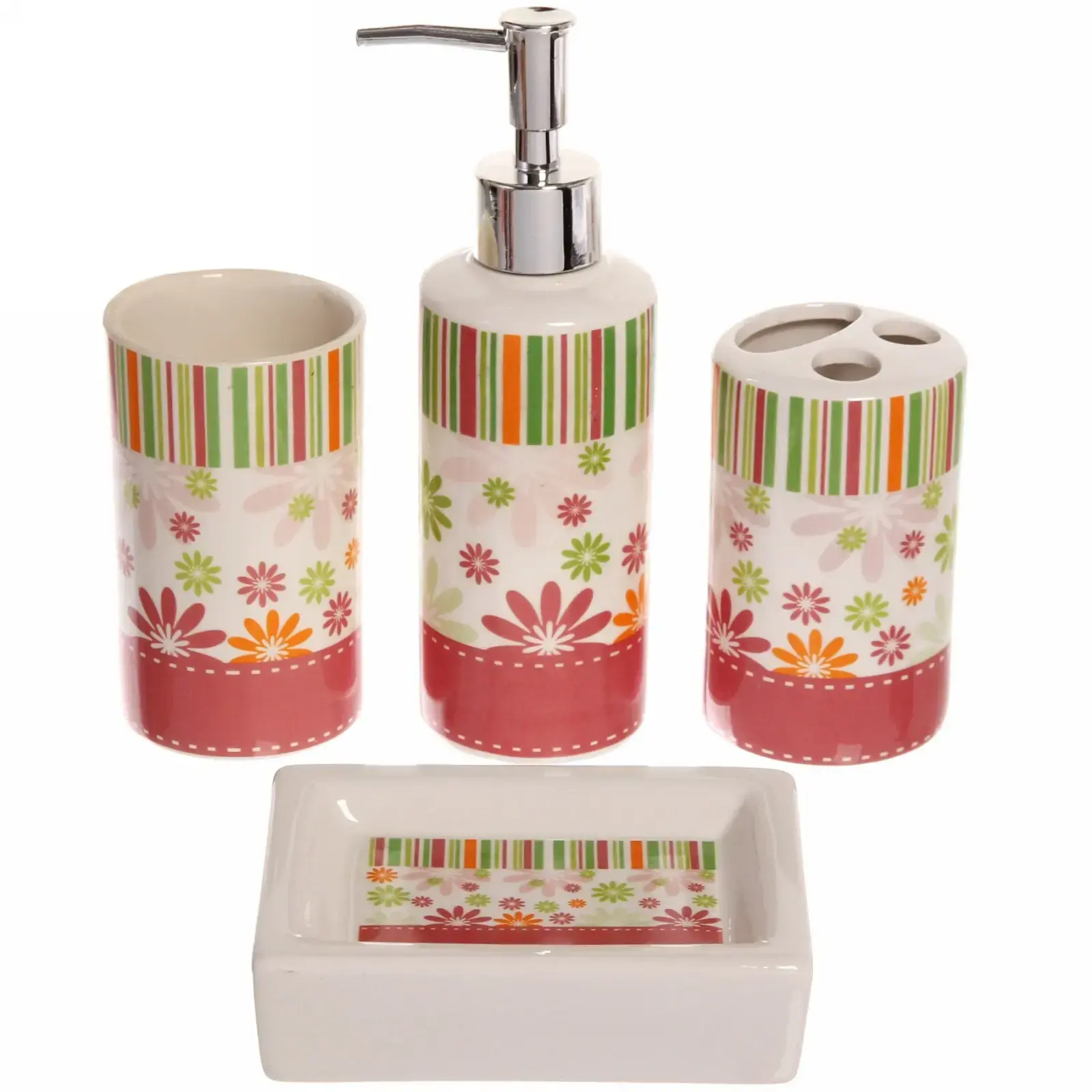 Набор для ванной «Салют»: 4 предмета, керамика, цветочный узор, зелено-белый