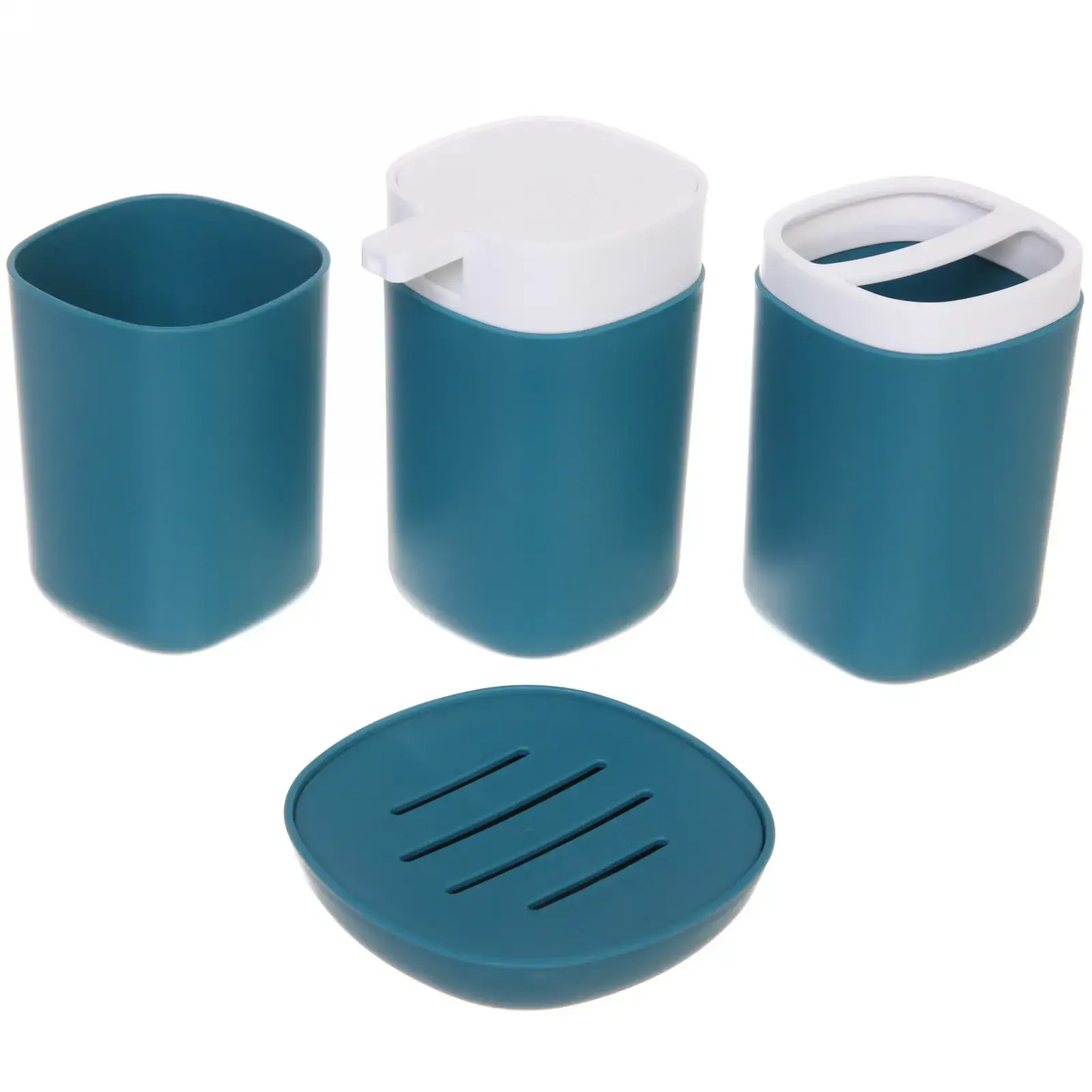 Изготовленный из прочного пластика, комплект устойчив к воздействию воды и моющих средств. Темно-бирюзовый цвет добавляет стильный акцент в интерьер, а нейтральный дизайн сочетается с любым оформлением комнаты. Подставка с дренажными отверстиями идеально подходит для хранения мыла или мочалок.