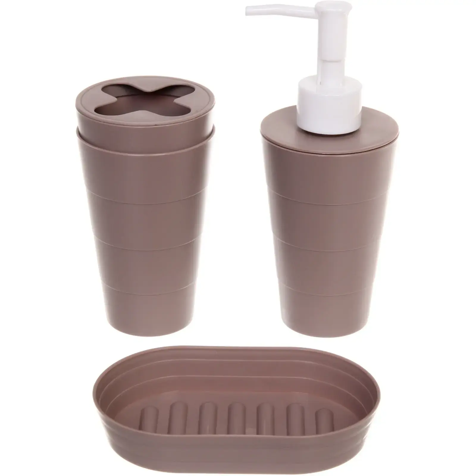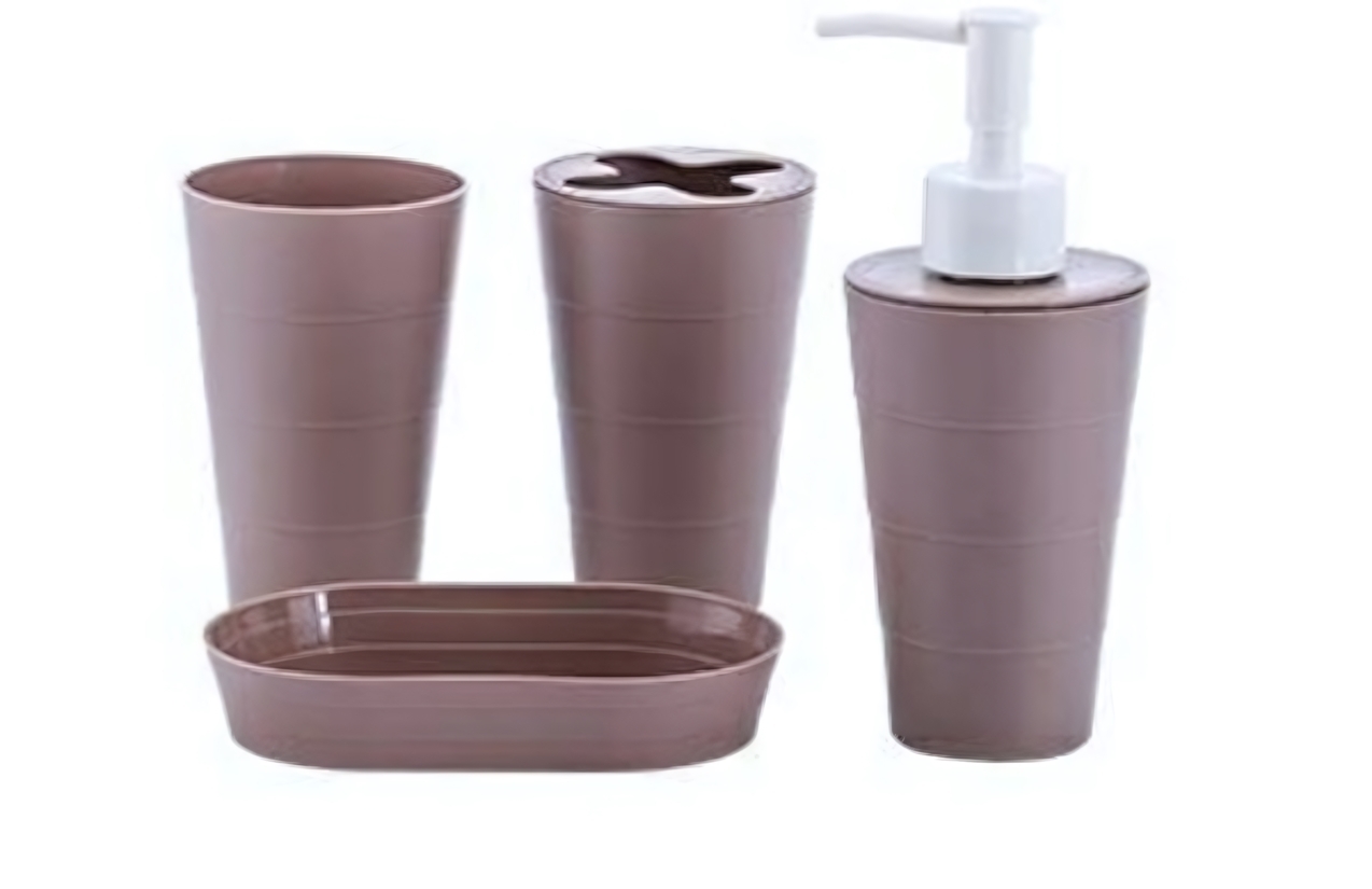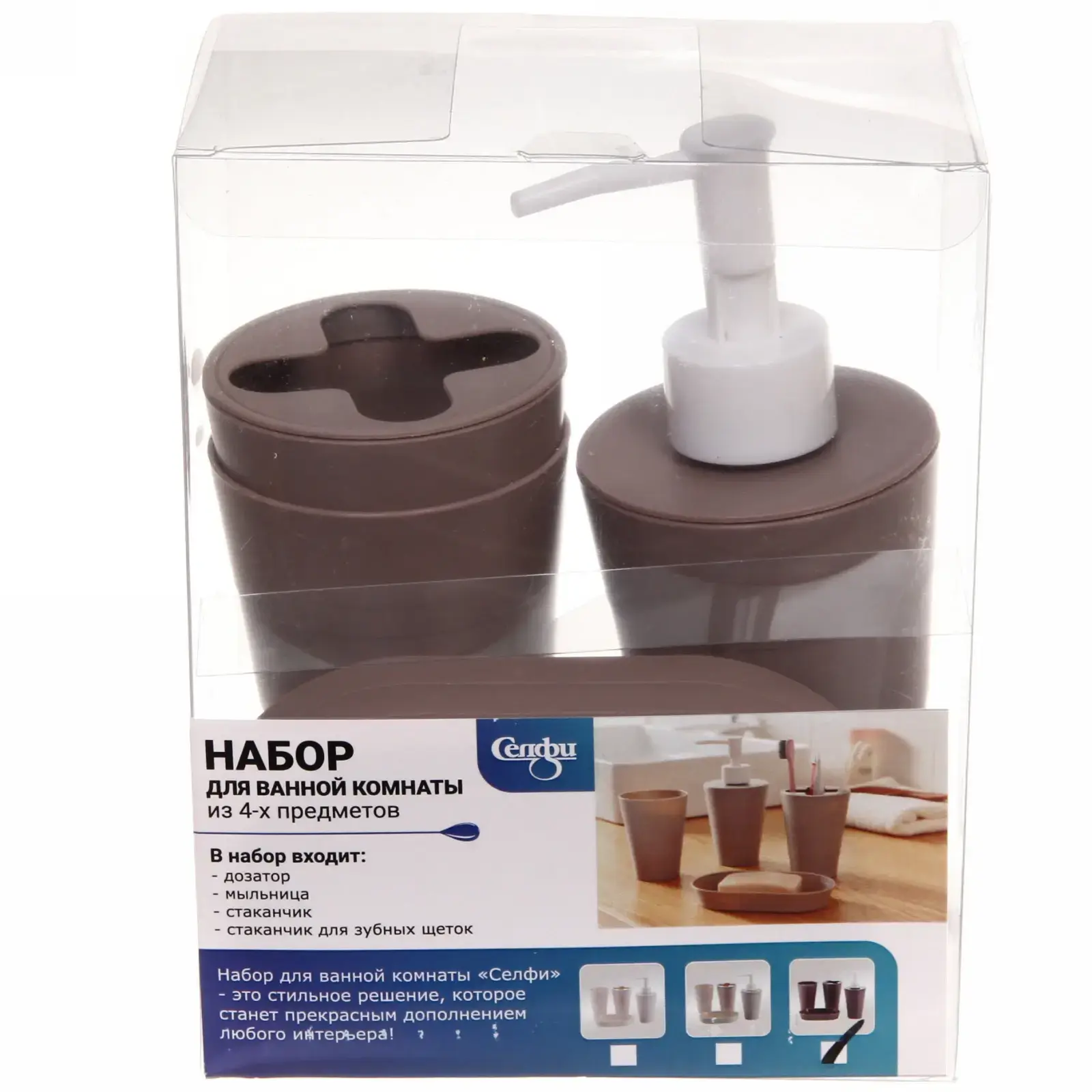 Набор из 4 предметов в элегантном шоколадном цвете сочетает функциональность и современный дизайн. Идеально подходит для организации пространства у раковины: держите зубные щетки, мыло и аксессуары в порядке, создавая атмосферу уюта.