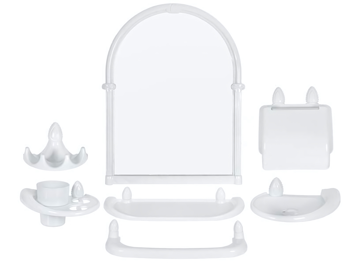 Набор для ванной "Олимпия" в белом цвете помогает поддерживать идеальную чистоту и уют, комбинируя современный пластиковый дизайн с практичностью каждой детали. Всё необходимое собрано в едином стиле и продуманно: зеркало овальной формы с приятной арочной верхней частью, полочка, держатель для геля или мыла, компактная подставка и крючок для полотенец.
