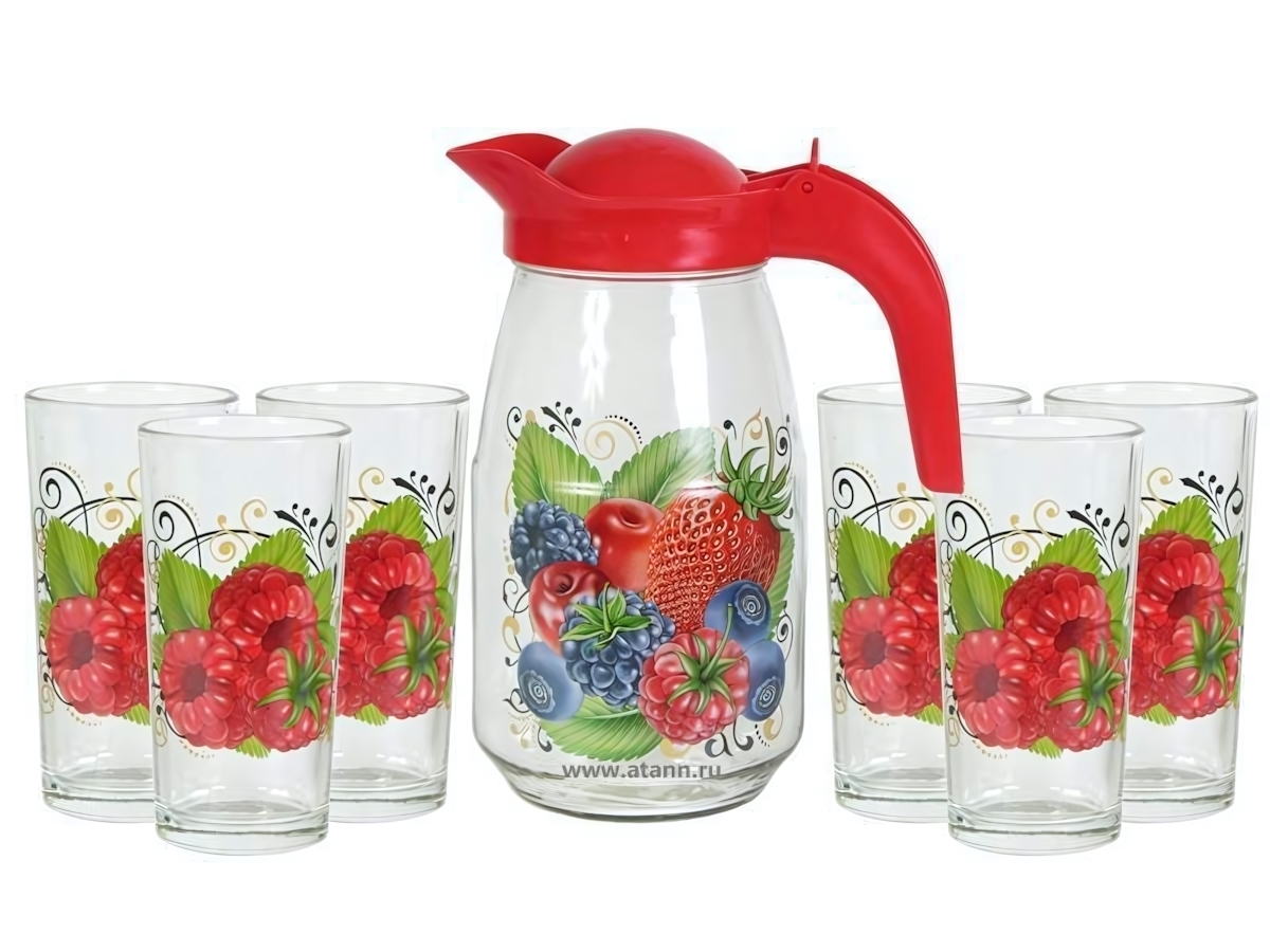 Почему выбирают именно этот набор: В комплекте расположены все необходимые предметы для подачи напитков, выполненные из прочного и красивого стекла. Его дизайн с ягодными мотивами создает приятную атмосферу, а крышка кувшина надежно сохраняет свежесть напитков.