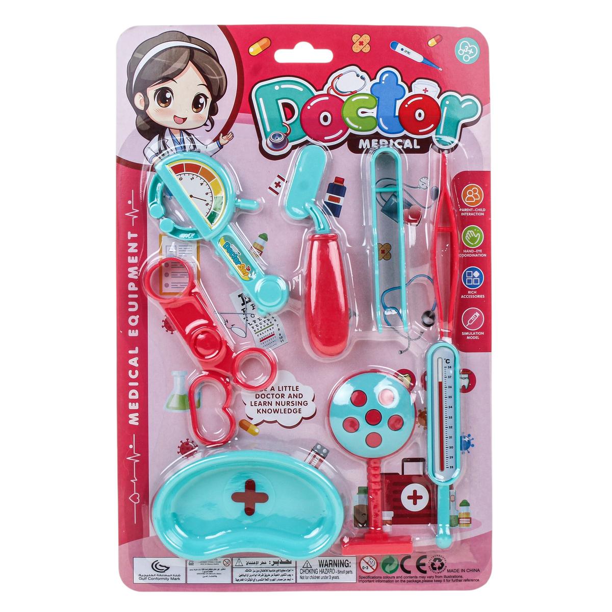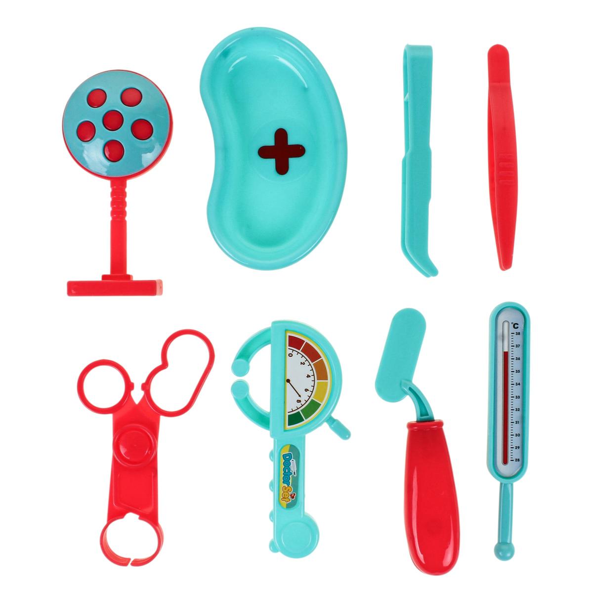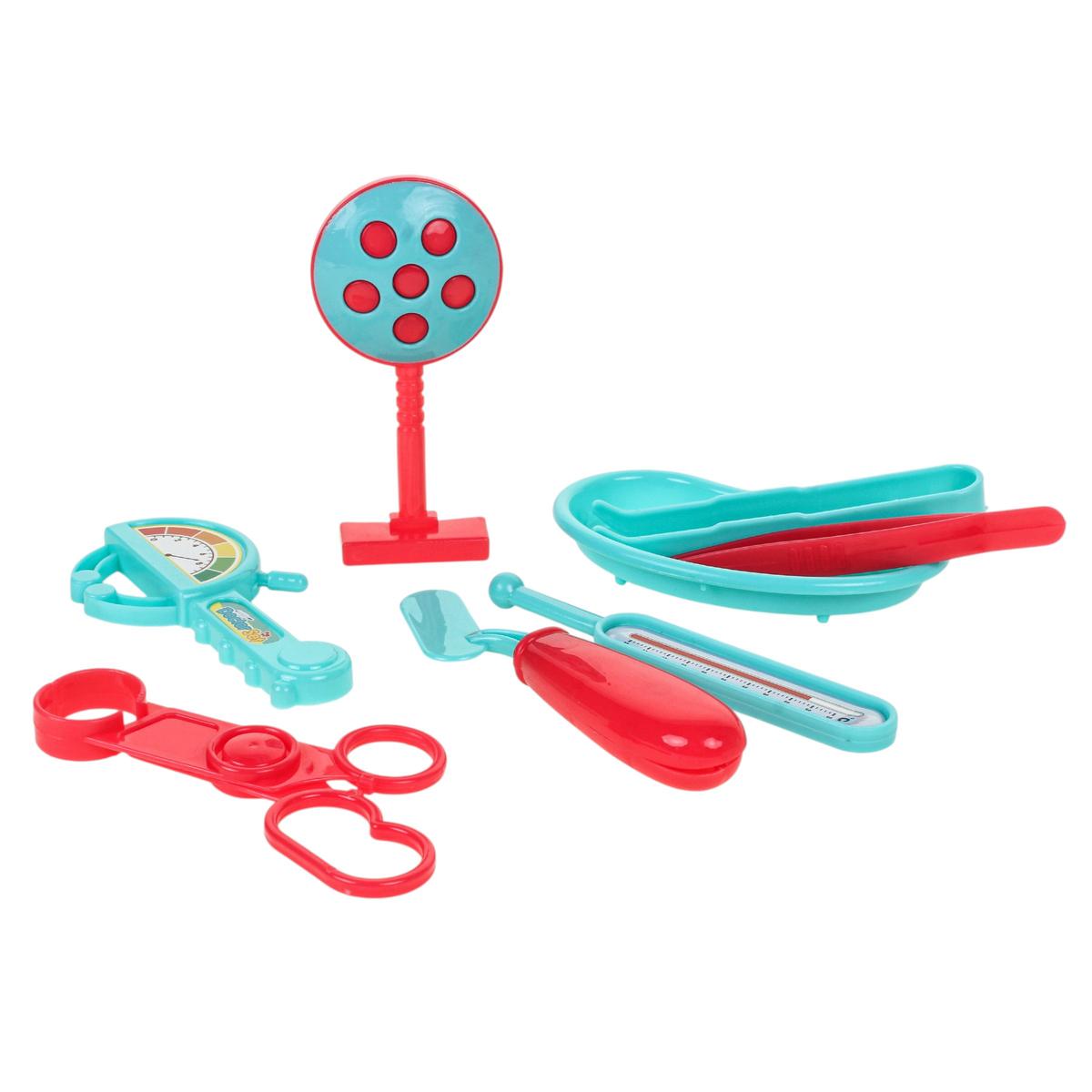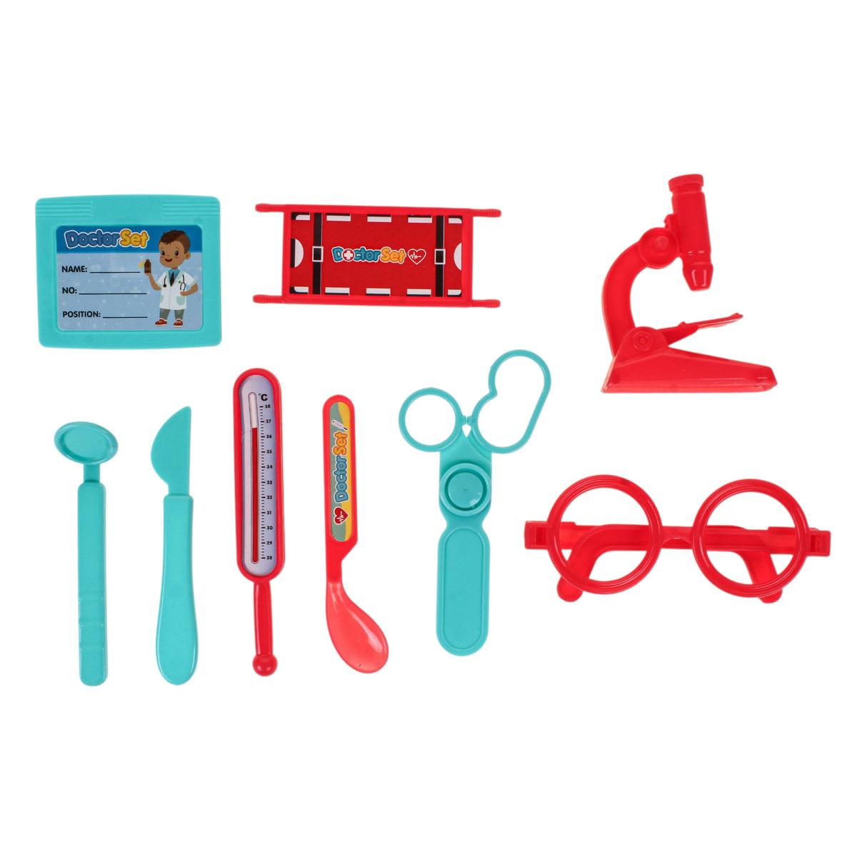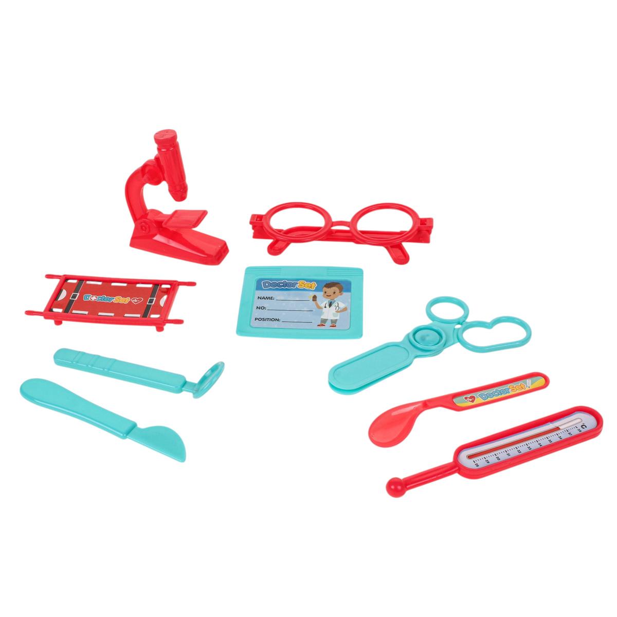 Набор выполнен из пластика и представлен в блистерной упаковке размером 30х20 см, что удобно для хранения и транспортировки. В ассортименте доступны разные варианты комплектации: от игрушечного микроскопа и очков до тонометра, молоточка и других медицинских аксессуаров. Отгружается один набор, вариант определяется случайным образом.