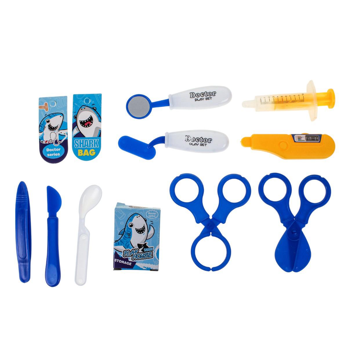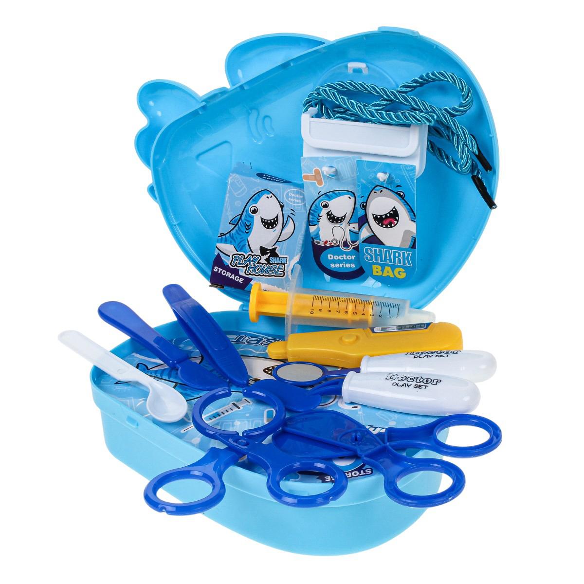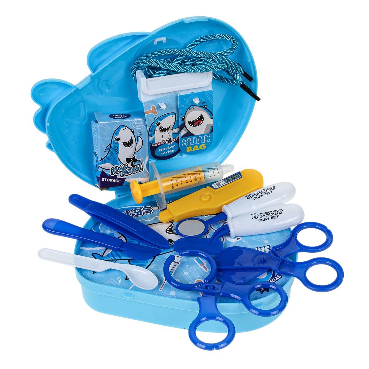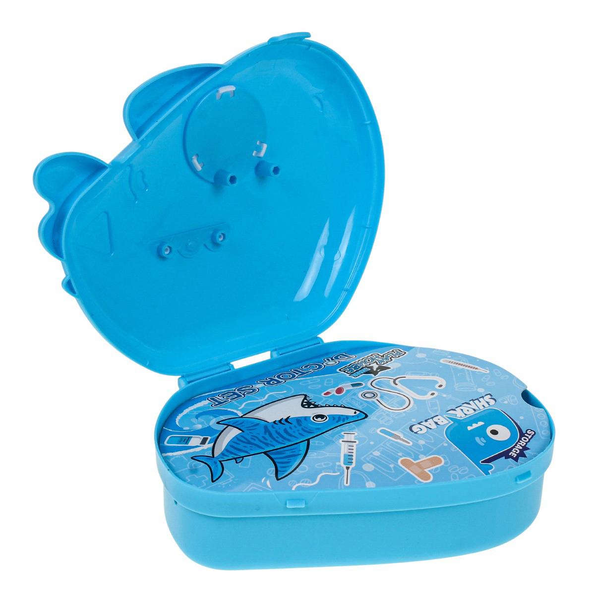 Внутри стильного чемоданчика, выполненного в форме дружелюбной акулы, скрывается целый арсенал игрушечных медицинских инструментов: