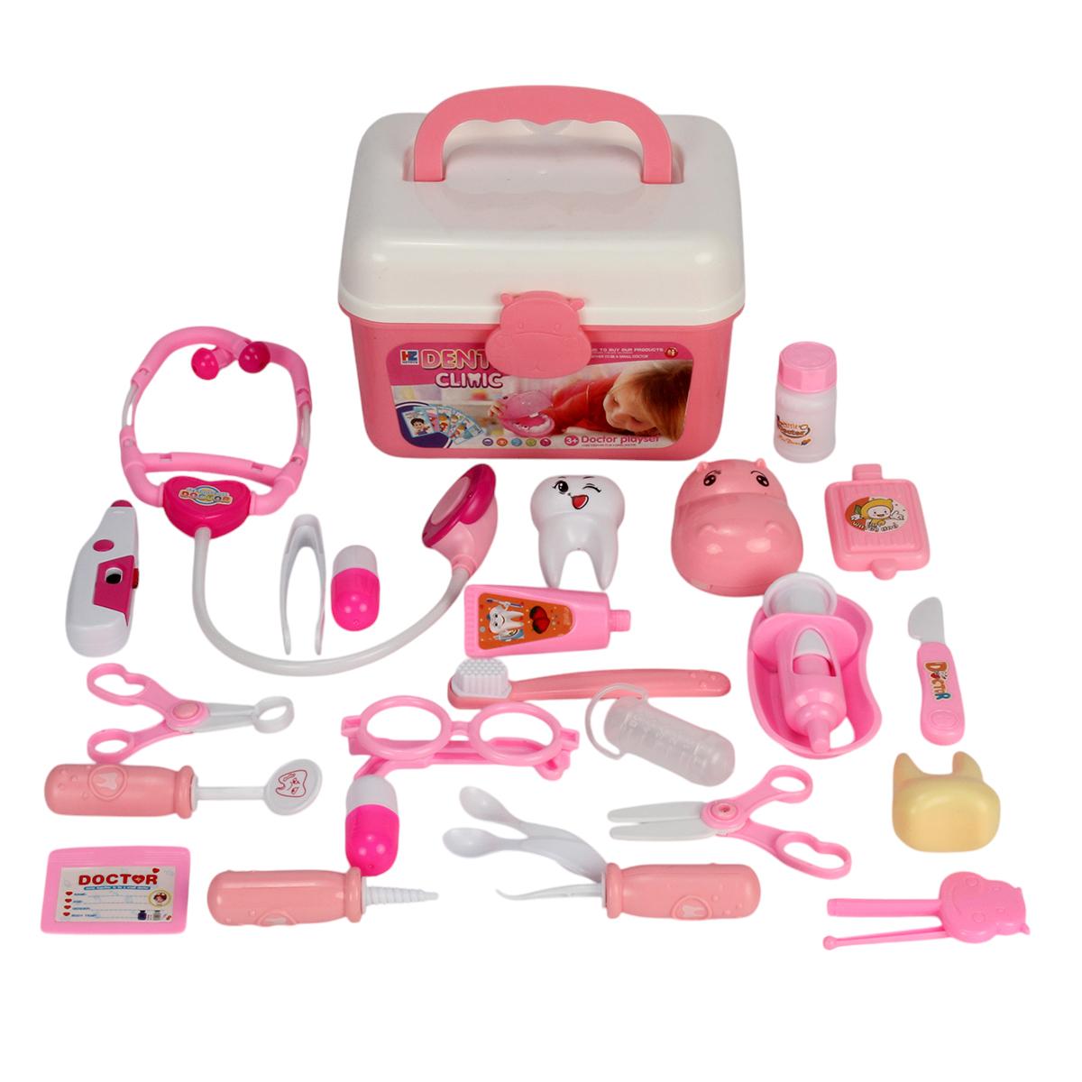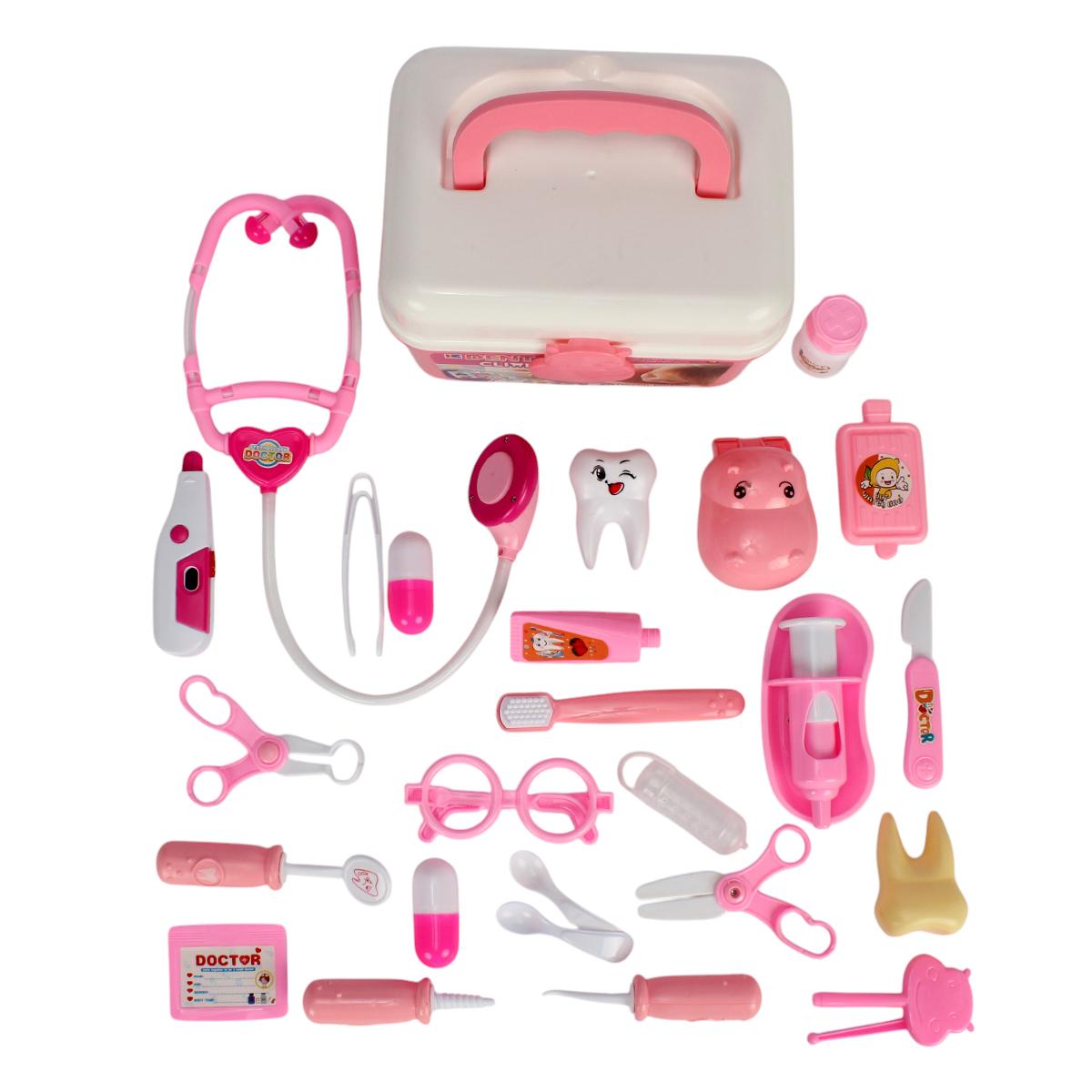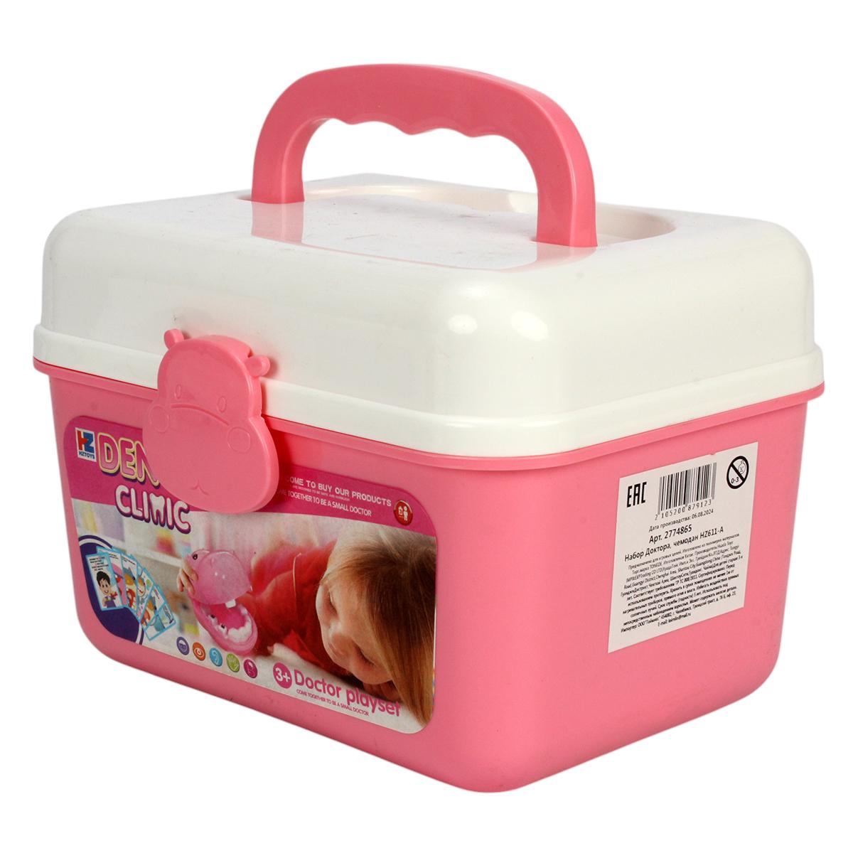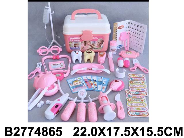 Этот красочный и функциональный набор позволяет ребёнку почувствовать себя настоящим врачом или стоматологом. В прочном пластиковом кейсе с удобной ручкой хранятся 37 аксессуаров, включая стетоскоп, шприцы, термометр, зубную щётку, модель зуба и множество других инструментов. Яркая розово-белая цветовая гамма делает игру ещё более увлекательной и привлекает внимание детей.