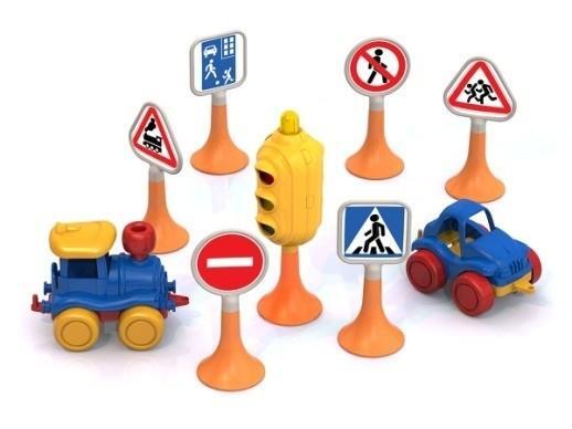 В набор входит световой светофор высотой 16,5 см, шесть дорожных знаков высотой 12 см (круглые, квадратные, треугольные) и две машинки «нордик» с большими колёсами. Все элементы легко фиксируются на плоской поверхности и устойчивы к активным играм.