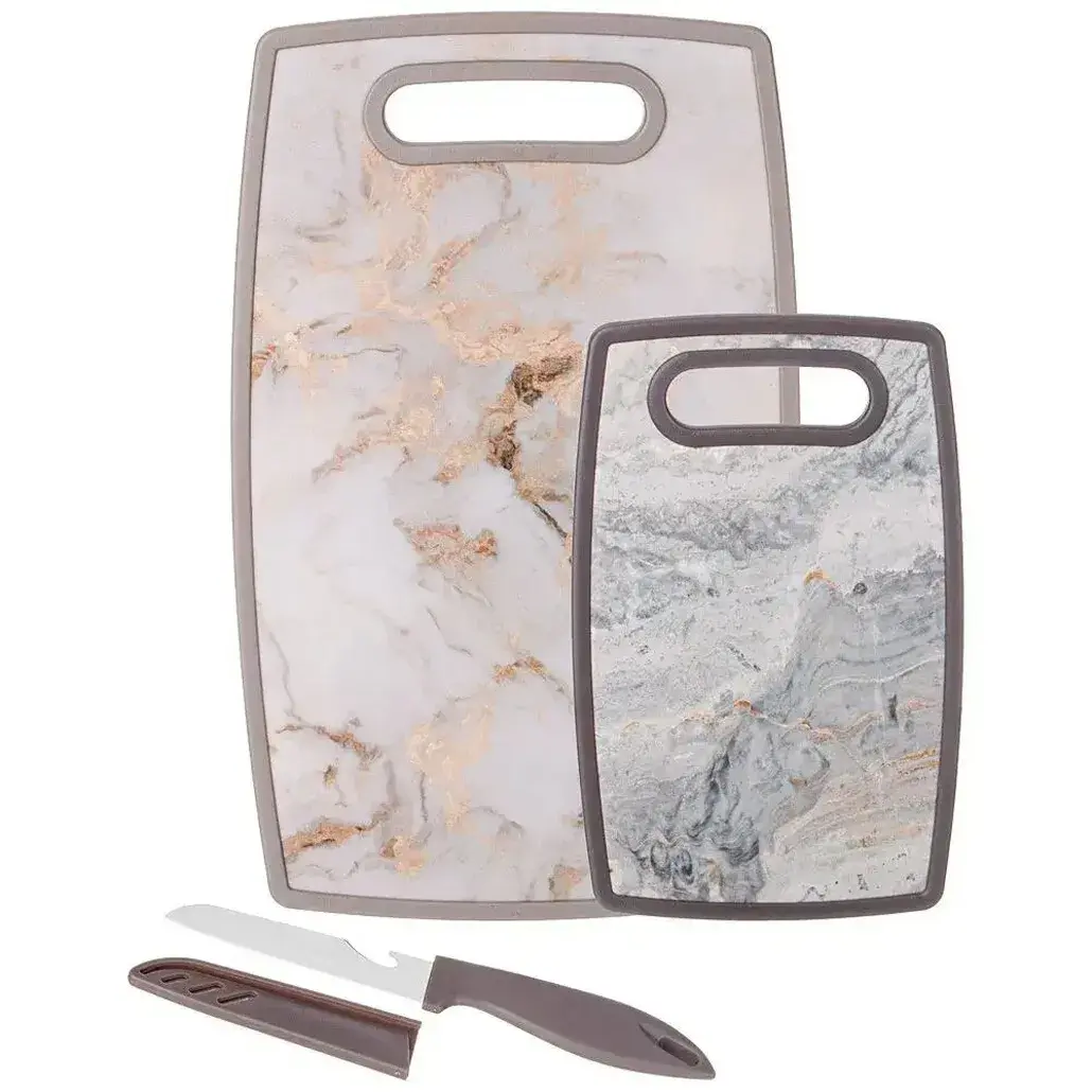 Комплект из двух практичных досок и эргономичного ножа станет незаменимым помощником на вашей кухне. Мраморный дизайн с золотистыми акцентами добавит эстетики процессу приготовления, а продуманная конструкция обеспечит максимальный комфорт.