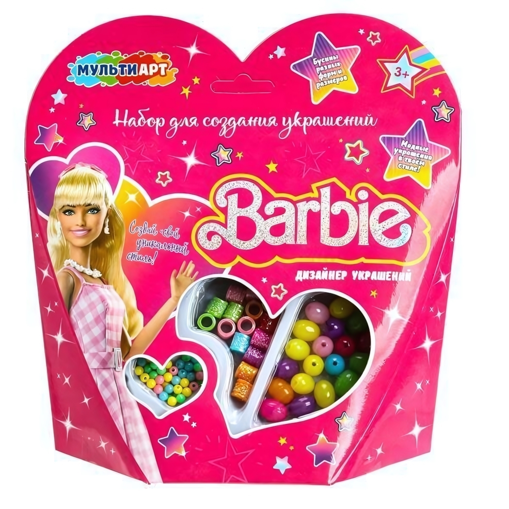 Набор для создания украшений 'Барби муви' от ТМ 'Мульти Арт' — это идеальный подарок для маленьких модниц, который не только развлекает, но и развивает творческие способности. Яркая упаковка в форме сердца с изображением куклы Барби привлечет внимание любой девочки, а разнообразие бусин позволит создавать уникальные аксессуары.