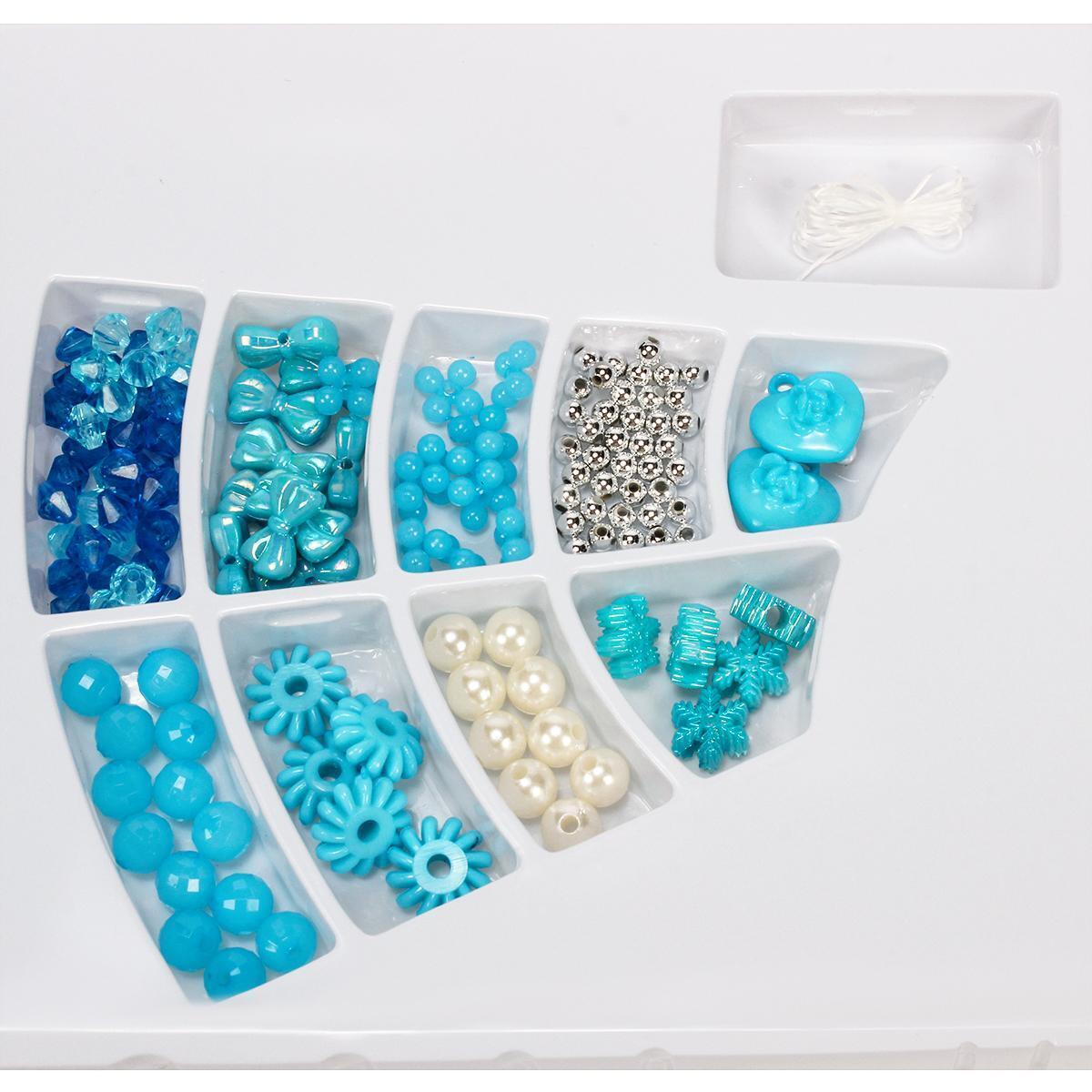 Размер упаковки составляет 26 х 20 х 4 см, что делает его удобным для хранения и транспортировки. Набор включает бусины различных оттенков, включая голубые, белые и прозрачные элементы, а также пластиковые детали в форме снежинок и цветочков. Дайте возможность вашему ребенку проявить креативность и создать свои собственные модные украшения!