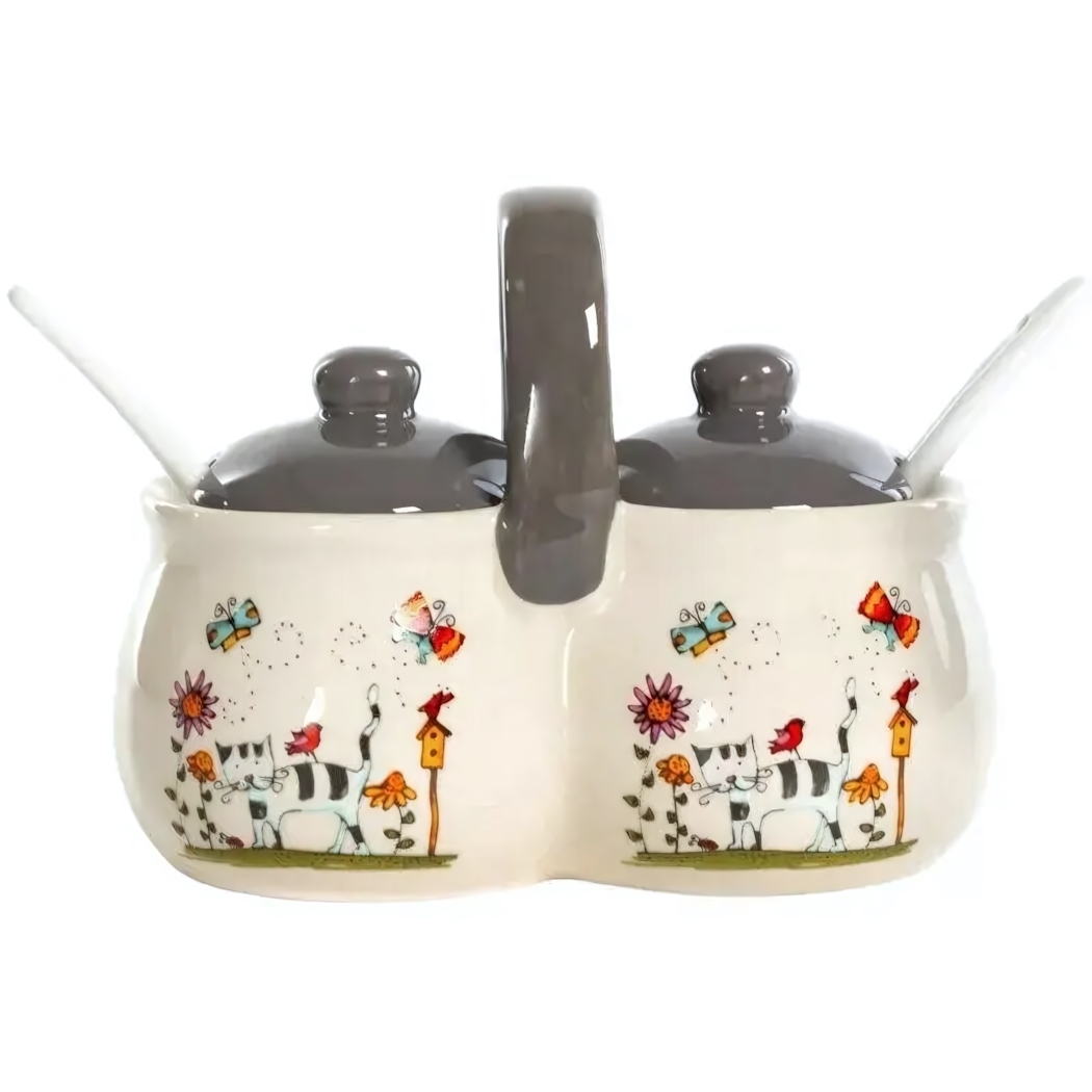 Набор для специй 2-секционный 250 мл с ложками и крышками, керамика, дизайн «Полосатый Кот»