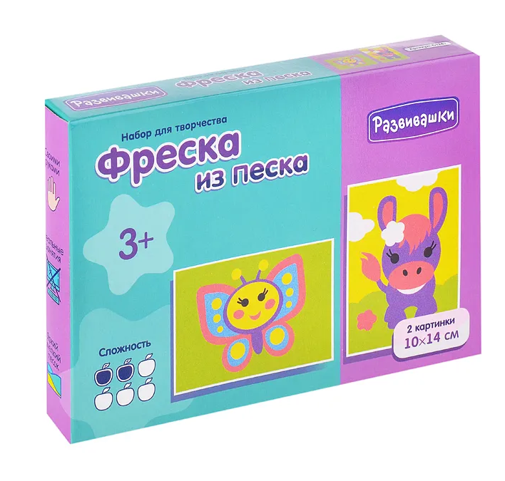 Яркая фреска из песка подарит ребёнку от 3 лет увлекательный творческий опыт. Безопасные материалы и продуманная комплектация позволяют сосредоточиться на главном – развитии художественного вкуса и координации движений.