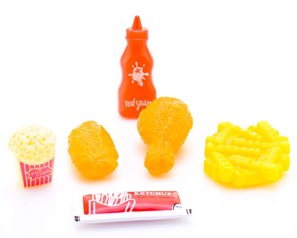 В набор входят: куриные ножки, картофель фри, стакан попкорна и упаковка кетчупа. Все элементы имеют гладкую поверхность и яркие цвета, что делает их привлекательными для детей. Размеры предметов идеально подходят для детской игровой кухни, позволяя легко манипулировать ими. Набор 'Еда' станет отличным дополнением к любой игровой кухне и подарит множество часов увлекательной игры.