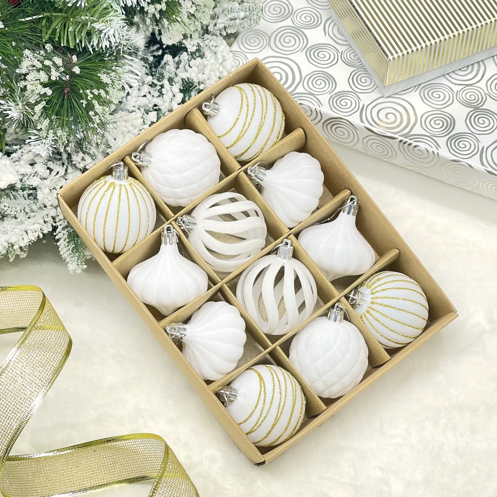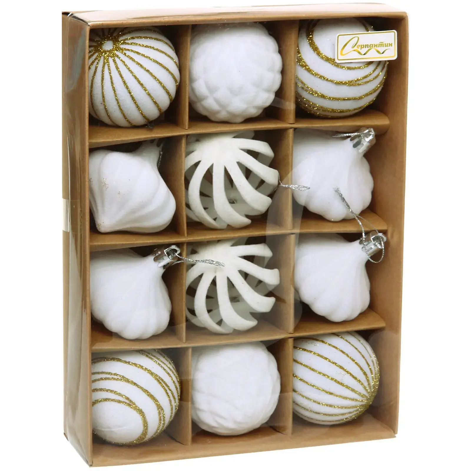 Элегантный набор из 12 ёлочных украшений 'Восточная ночь' станет основой вашей праздничной композиции. Белоснежные шары с золотыми акцентами создают роскошный и утончённый образ новогодней ёлки.