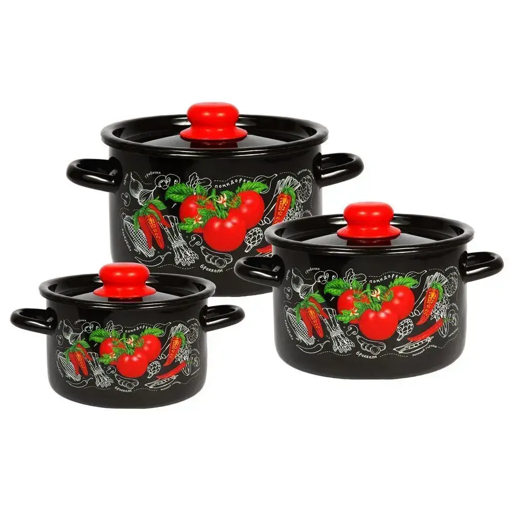 Набор кастрюль эмалированных "Помидорки" 1.5 л, 4.5 л, 9 л, 3 шт, с крышками, декор овощи