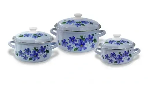 Размеры кастрюль идеально подобраны для различных нужд: от приготовления супов до запеканок. Цветочный узор на белом и голубом фоне придаст вашему столу особый шарм. Не упустите возможность сделать вашу кухню более уютной и функциональной с этим набором эмалированной посуды!