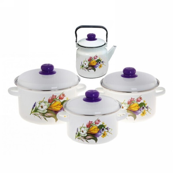 Каждая кастрюля и чайник имеют белый цвет с цветочной росписью, что делает их не только функциональными, но и эстетически привлекательными. Размеры кастрюль позволяют готовить различные блюда, а чайник объемом 3,5л идеально подходит для заваривания чая или кипячения воды. Набор станет отличным подарком для любителей кулинарии и тех, кто ценит красоту в быту.