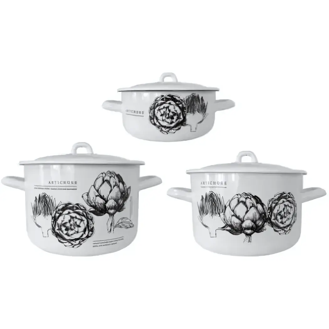 Набор эмалированной посуды «Artichoke», 3 кастрюли с крышками, белый с рисунком, для легкой очистки