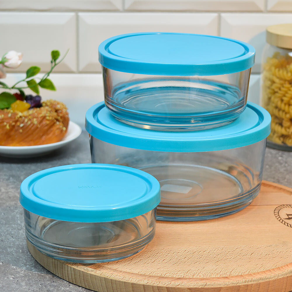 Этот набор из трёх контейнеров разного объема (420 мл, 840 мл и 1500 мл) создан для удобного и безопасного хранения продуктов дома. Прозрачное стекло позволяет легко видеть содержимое, а герметичные пластиковые крышки синего цвета сохраняют свежесть и аромат еды.