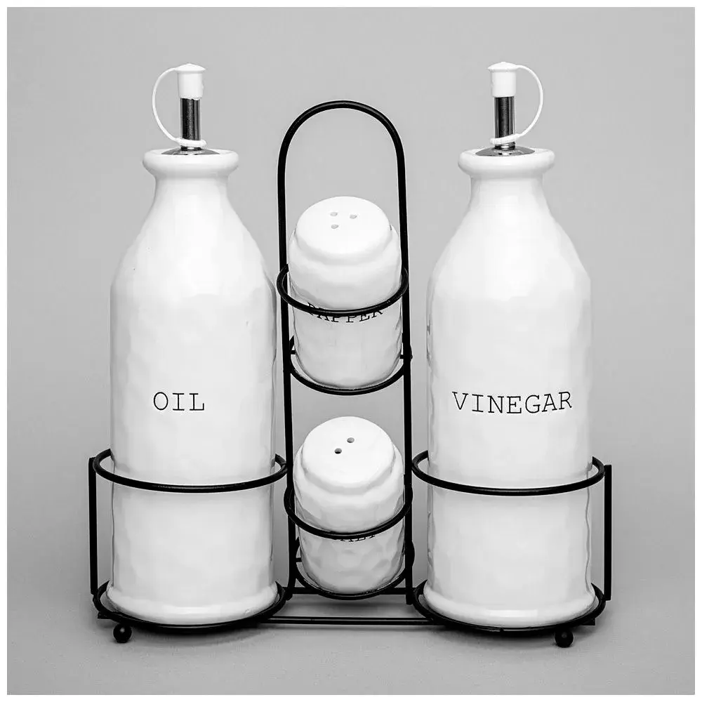 Набор из 5 предметов с металлической подставкой создан для удобного хранения и подачи масел, уксуса и специй. Идеальное сочетание функциональности и современного дизайна дополнит ваш стол и кухонный интерьер.