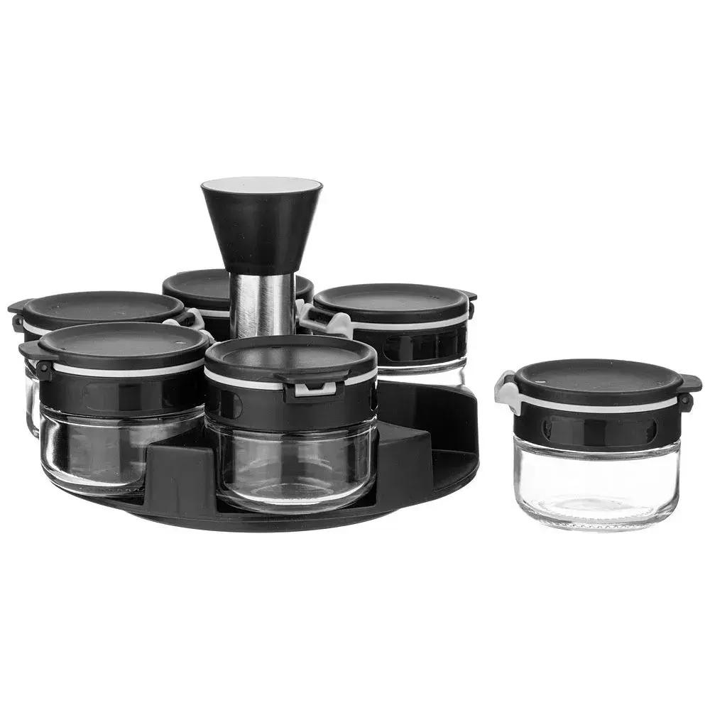 Набор стеклянных емкостей для специй 6шт с подставкой и воронкой, 85мл, черные крышки