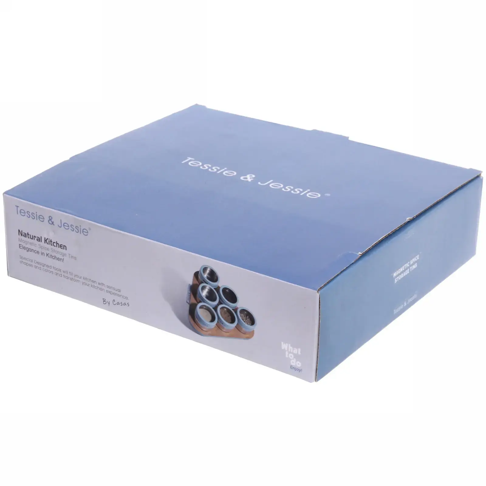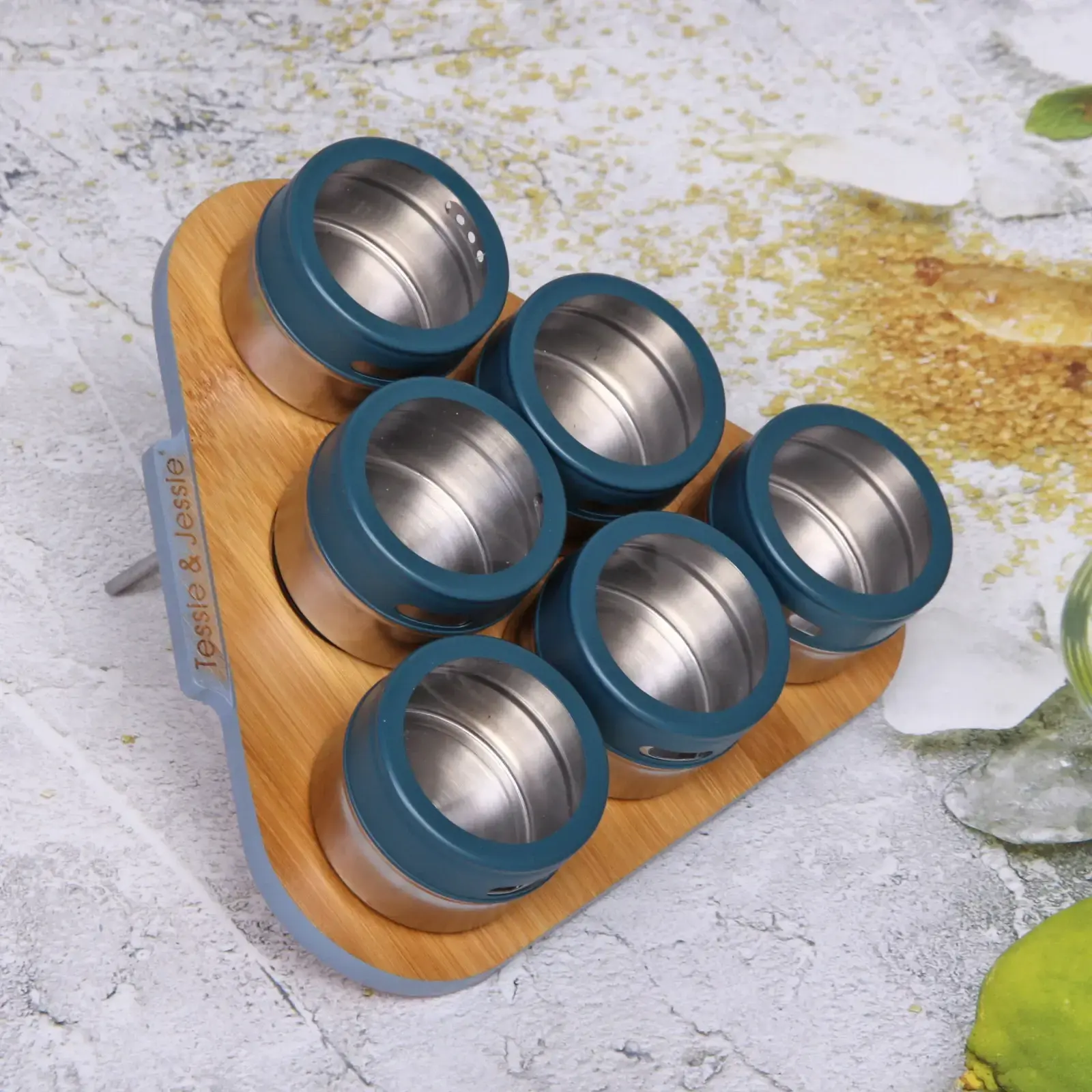 Набор из 6 стильных контейнеров на деревянной подставке создан для тех, кто ценит порядок и эстетику. Прозрачные стеклянные ёмкости с герметичными синими крышками защищают содержимое от влаги и сохраняют аромат специй.