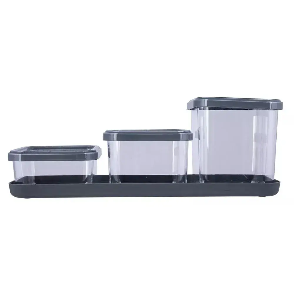 Практические детали: емкости имеют объем 0,4 л, 0,6 л и 0,9 л, выполнены из прозрачного пластика, крышки – темно-серого цвета. Размеры емкостей позволяют компактно разместить их на подставке, обеспечивая удобство эксплуатации и хранения.