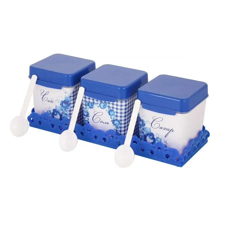 Контейнеры изготовлены из высококачественного пищевого пластика, устойчивого к механическим повреждениям. Синие крышки оснащены широкой оторочкой для удобного открывания. Подставка выполнена из прочного пластика с декоративным узором по краям.