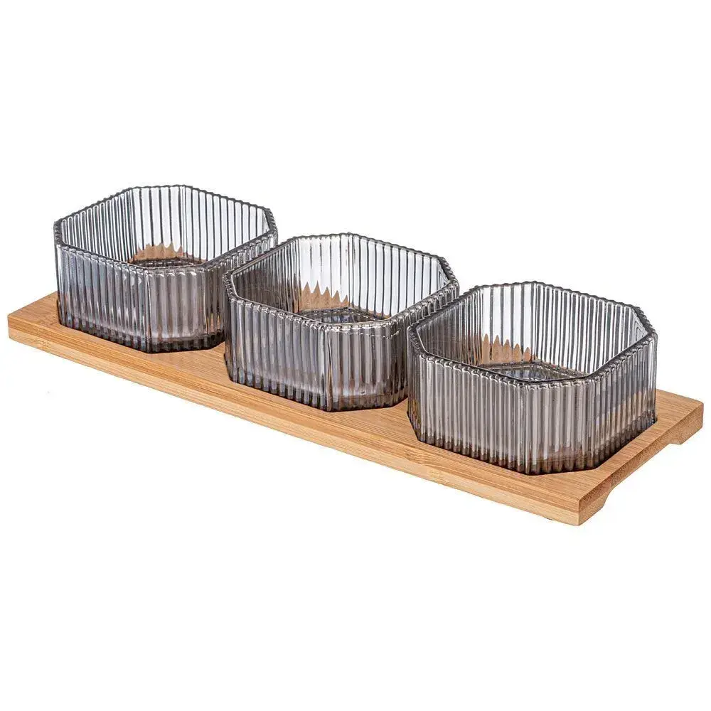 Набор 3 стеклянных контейнера с бамбуковой подставкой, 8.5х4 см, вертикальные ребра жесткости