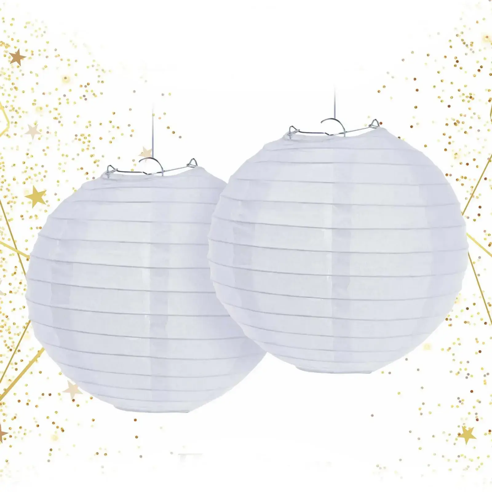 Каждый фонарик имеет диаметр 25 см — оптимальный размер для создания акцента без перегрузки пространства. Горизонтальные складки на бумаге создают интересную игру света и теней, а металлический каркас гарантирует сохранение формы даже при длительном использовании.