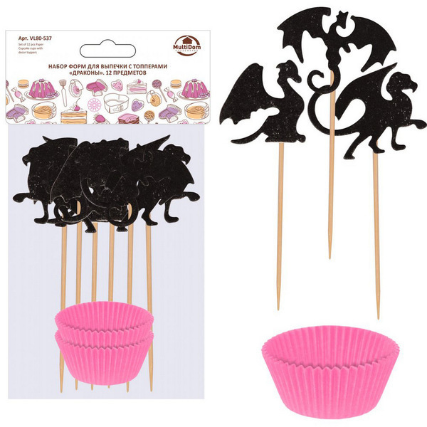 В набор входят 12 предметов: 6 бумажных форм для выпечки и 6 топперов с изображением драконов и других фантастических существ. Формы имеют диаметр 7,5 см и высоту бортика 3 см, что идеально подходит для кексов, капкейков и маффинов. Топперы, размером 13,5х6,5 см, выполнены на деревянных палочках, что делает их удобными для использования в различных кондитерских изделиях.