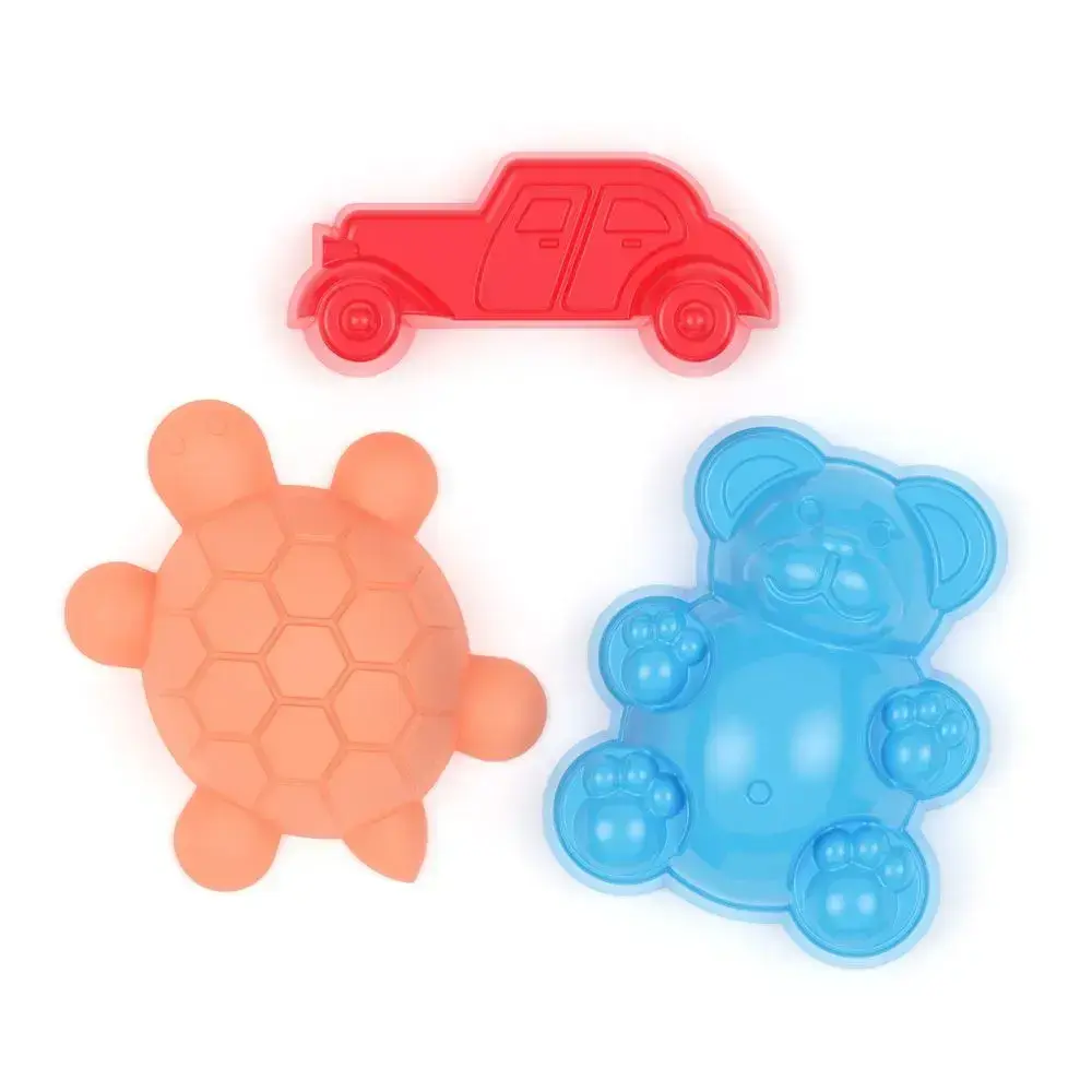 Пластиковые формочки для песка помогут вашему ребенку создавать яркие фигурки и развивать воображение. В наборе представлены три уникальные формы: автомобиль, черепаха и мишка - каждая из которых станет источником новых идей для игр.