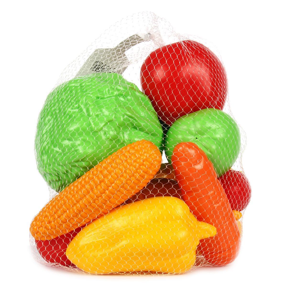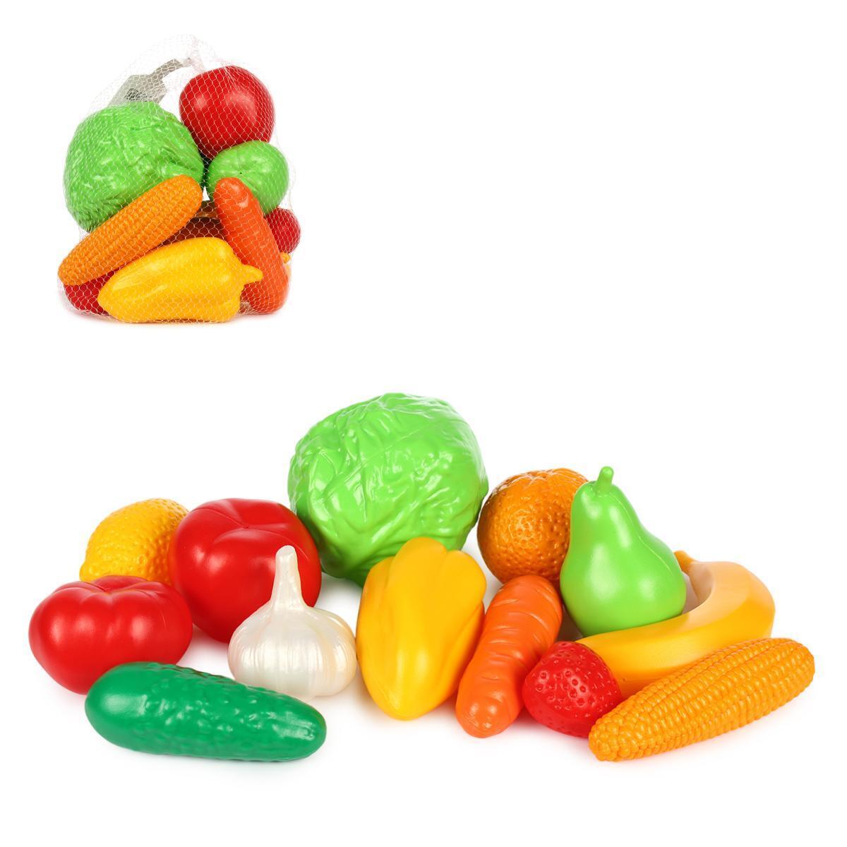 Набор включает 13 предметов: банан, груша, лимон, апельсин, яблоко, клубника, капуста, перец, помидор, огурец, морковка, чеснок и кукуруза. Упакован в удобную сетку для хранения и переноски.