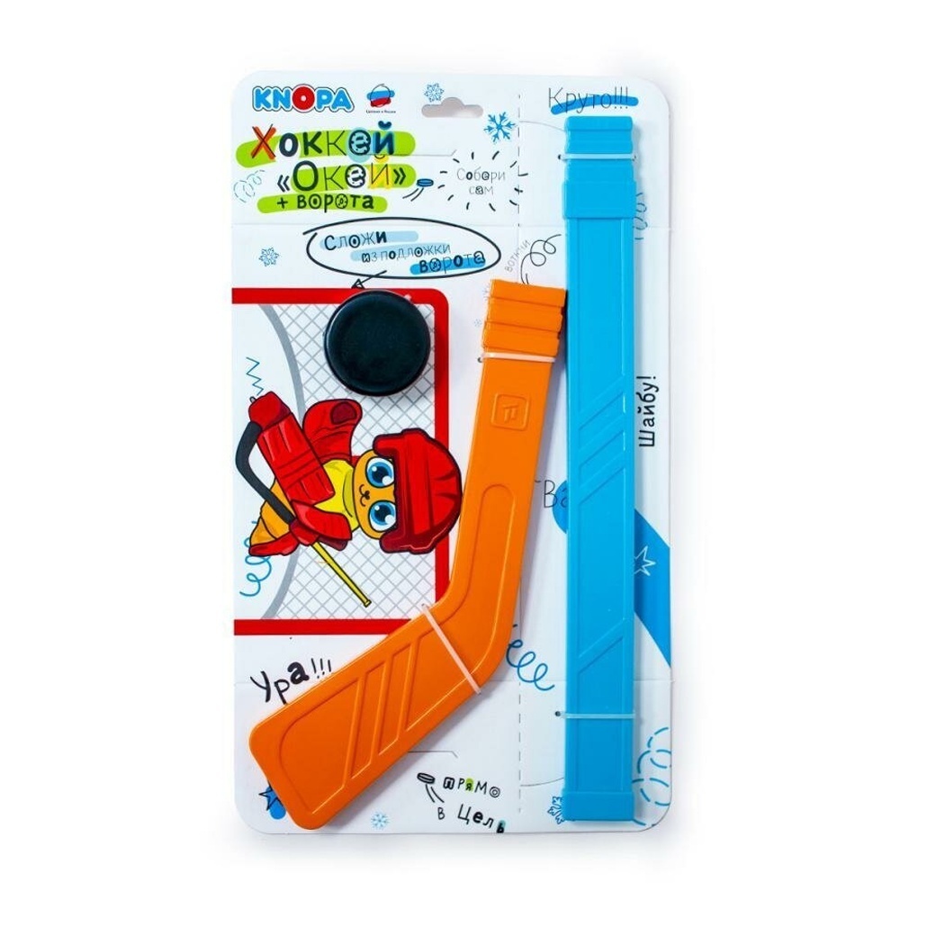 В комплекте: 1 клюшка (длина 65 см), 1 шайба (диаметр 8 см), 2 сборных элемента ворот (высота 35 см). Все детали прошли сертификацию по ГОСТ Р 53906-2010.