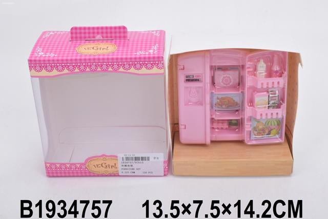 Размер холодильника — 11х8х4,3 см. Материал — глянцевый пластик с реалистичными изображениями продуктов в виде наклеек. В комплекте 1 холодильник и 7 предметов-«продуктов». Двери открываются, а внутренние полки позволяют организовать пространство по желанию ребёнка. Яркий розовый цвет делает игрушку привлекательной и запоминающейся.