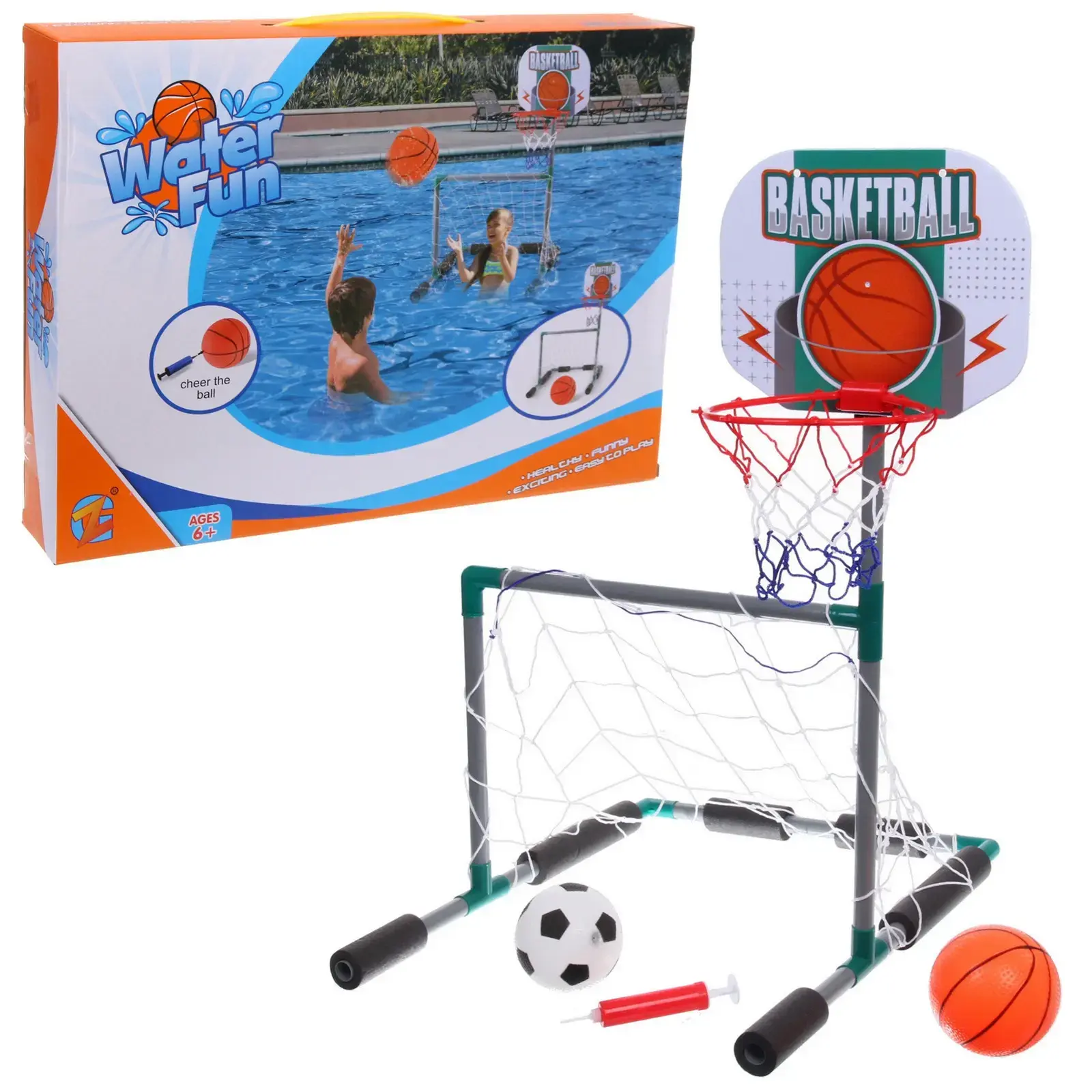 Этот набор легко устанавливается и подходит для использования как в бассейне, так и на пляже. Он станет отличным дополнением к вашему летнему отдыху, позволяя весело проводить время с друзьями и семьей. Насос для надувания кольца и мячей идет в комплекте, что делает процесс подготовки к игре быстрым и простым.