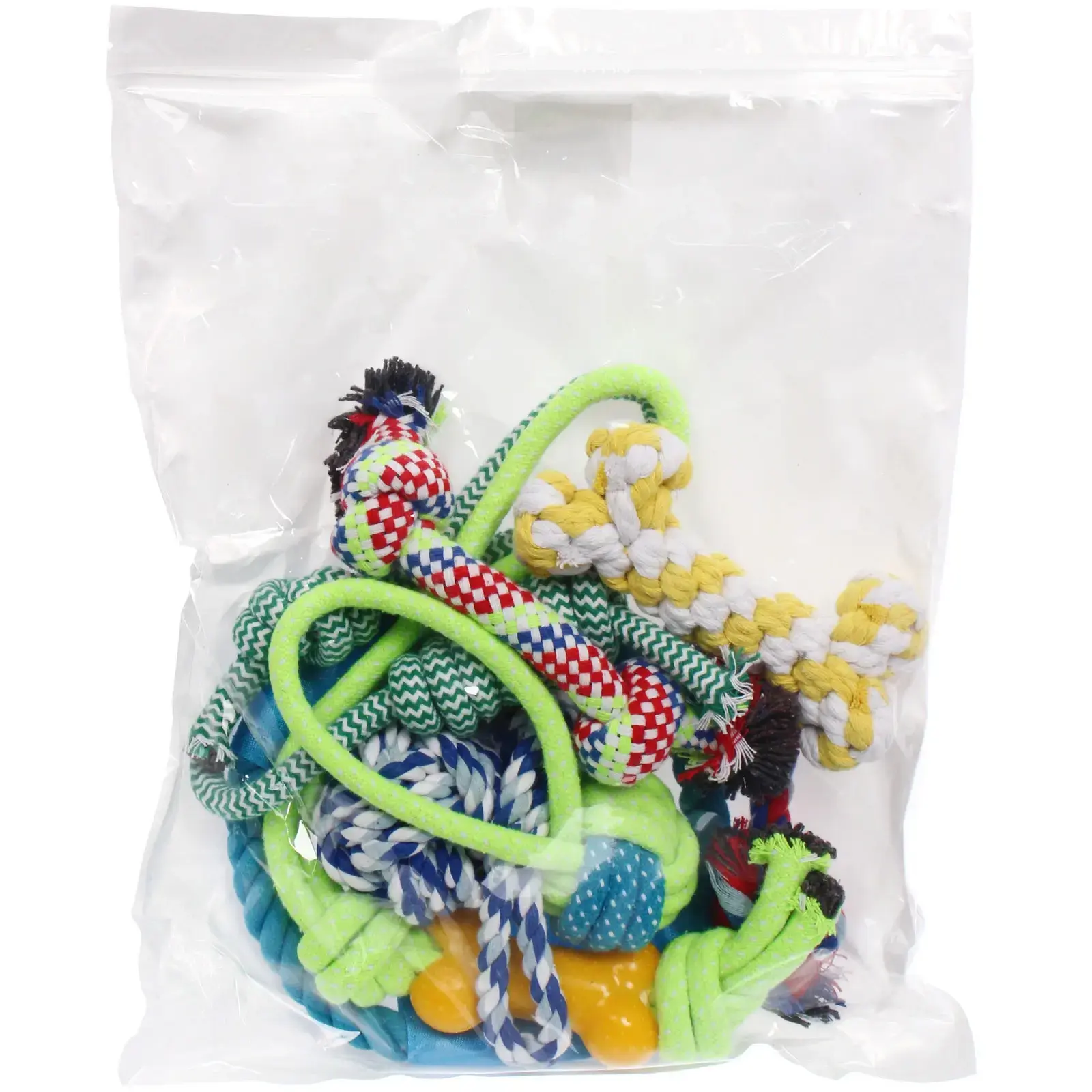 В набор входят игрушки различных форм: круглая, вытянутая, косточка и овал, выполненные в ярких цветах: зеленом, желтом, красном и белом. Размеры игрушек варьируются, но они подходят для собак малых и средних пород. Прозрачный пакет с подвесом позволяет удобно хранить и демонстрировать игрушки, а также обеспечивает видимость содержимого.