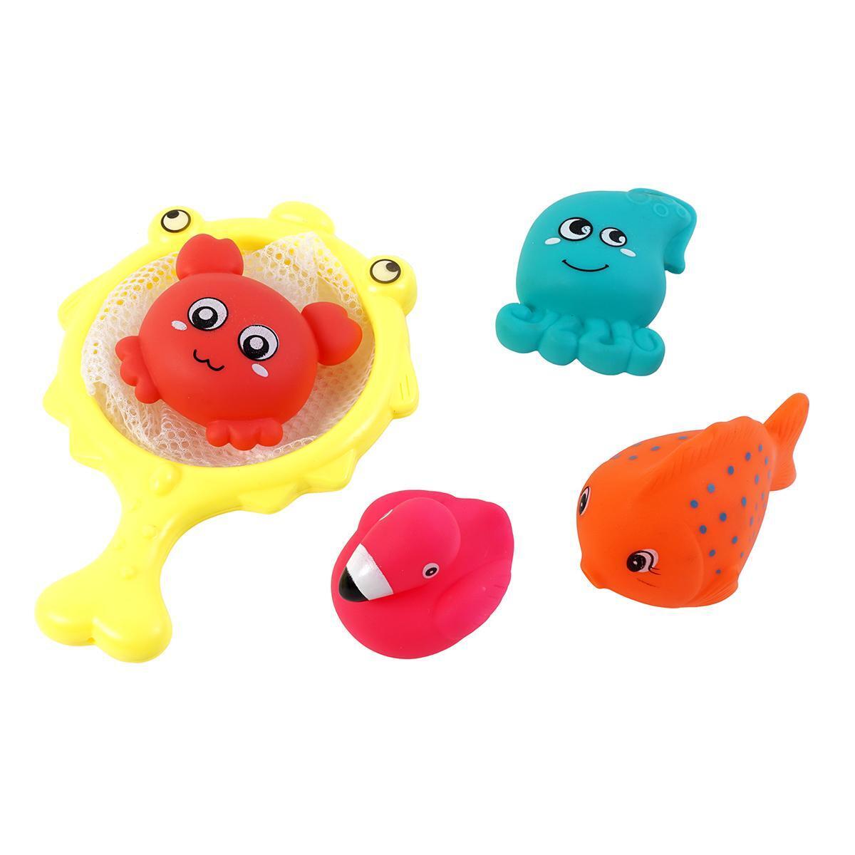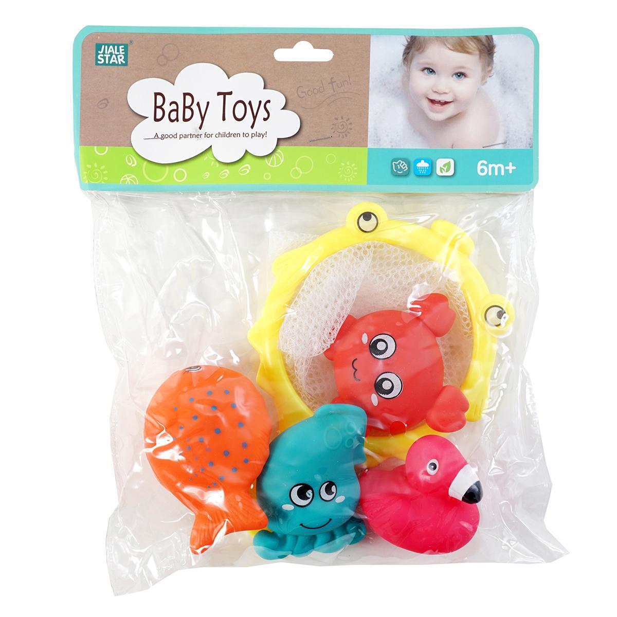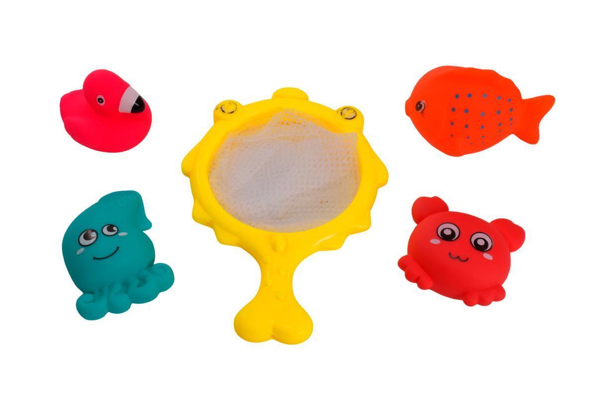 Этот набор игрушек для ванной станет незаменимым аксессуаром для веселых и безопасных водных игр вашего малыша. В комплект входит четырëх ярких плавающих фигурок и удобная сетка для ловли, которая помогает развивать координацию, внимательность и моторику рук ребенка. Игрушки выполнены из мягкого, эластичного и гипоаллергенного материала ПВХ, что гарантирует безопасность во время купания.