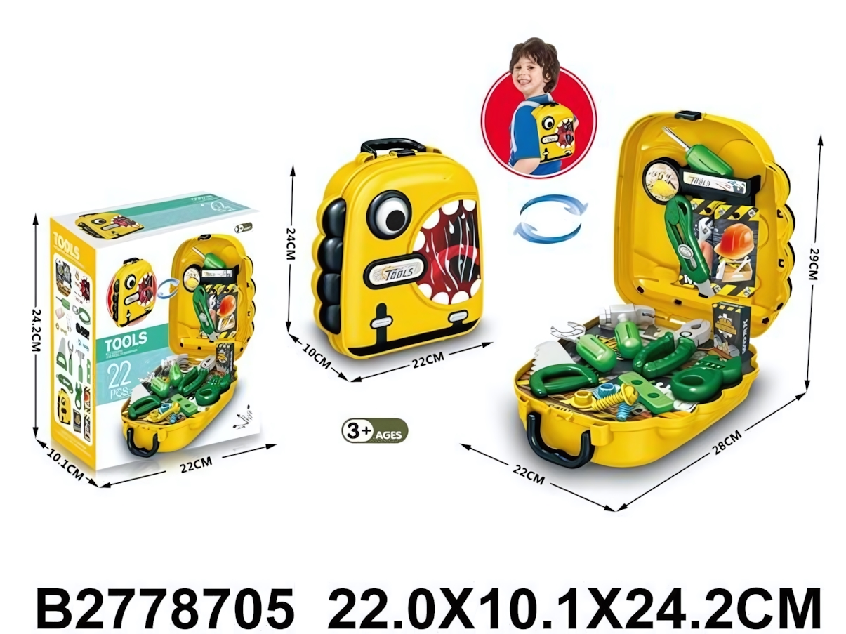 Размер упаковки (коробки): 22 x 10.1 x 24.2 см. Размер самого чемодана в закрытом состоянии: примерно 22 x 10 x 24 см. Вес набора оптимален для ребенка. Основной цвет чемодана — желтый, инструменты преимущественно зеленого и серого цветов.