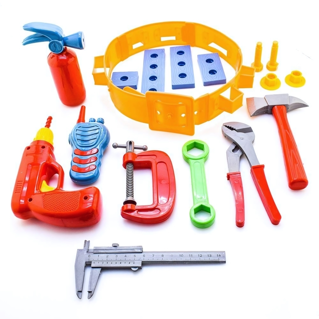 Огнетушитель, болты с гайками, дрель с вращающимся механизмом, функциональные тиски, гаечный ключ, клещи, измерительный инструмент и другие аксессуары для сюжетно-ролевых игр. Все элементы специально разработаны для детских рук: без острых краев, с удобными рукоятками.