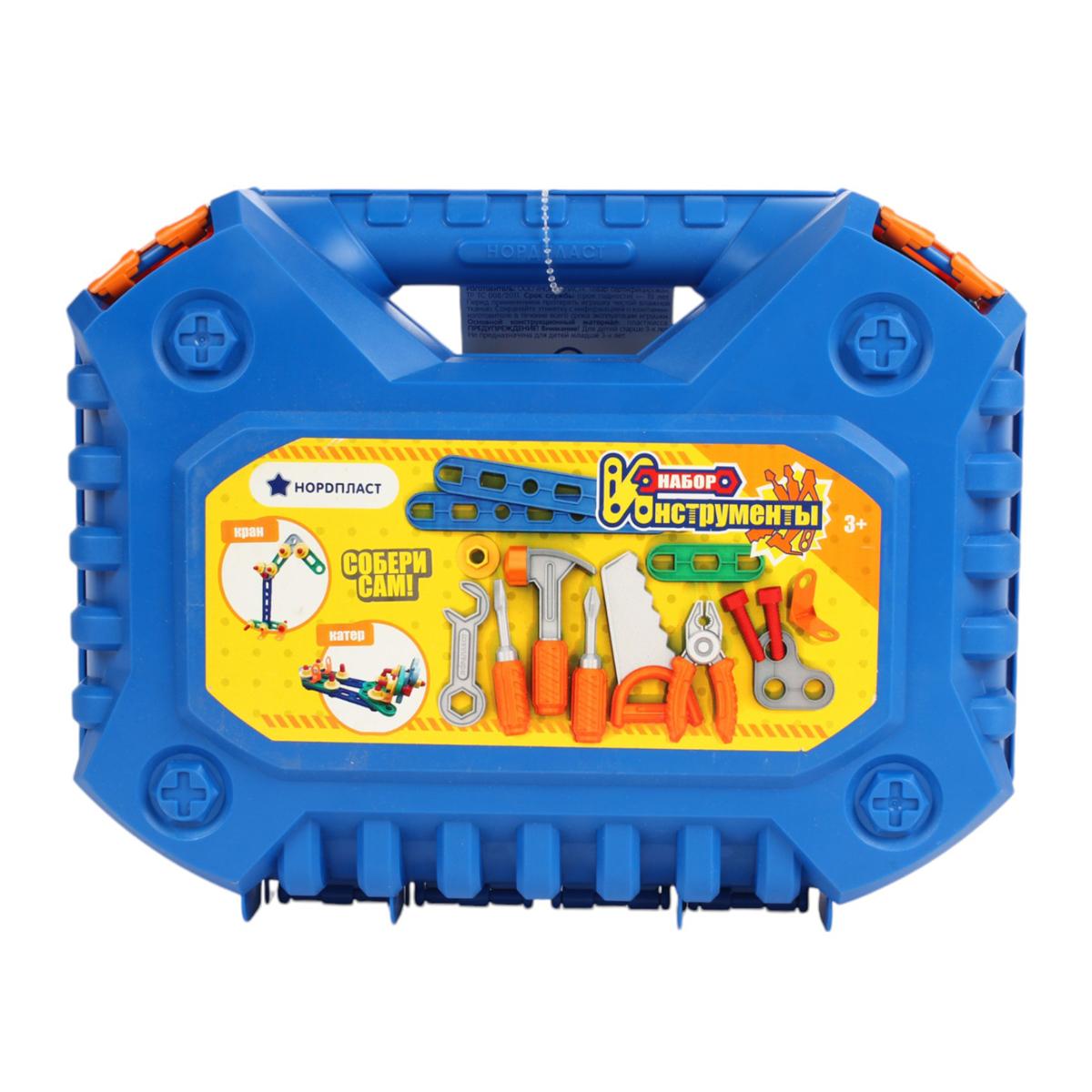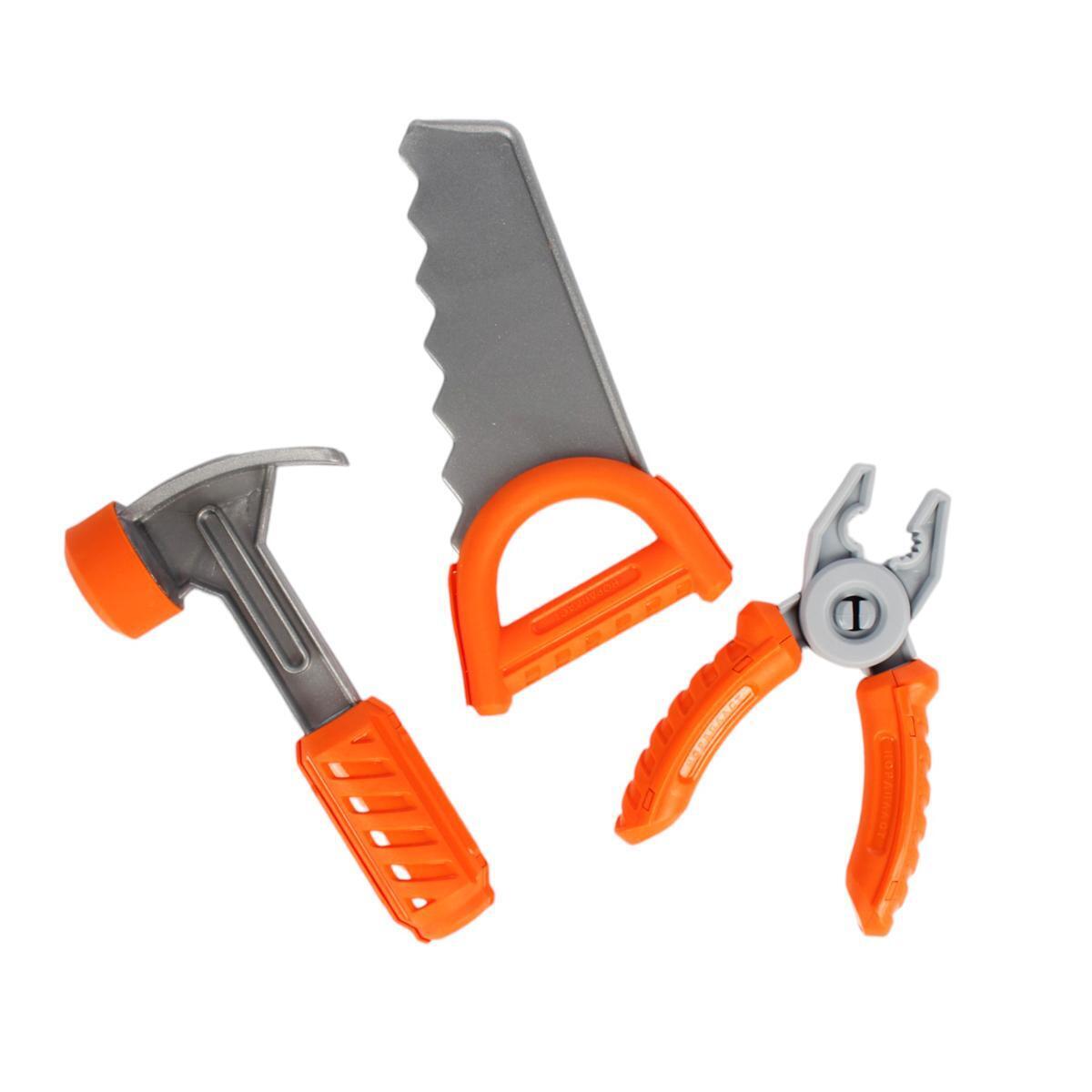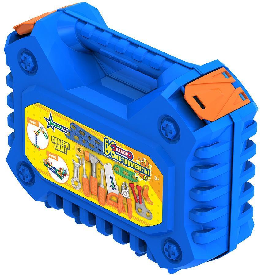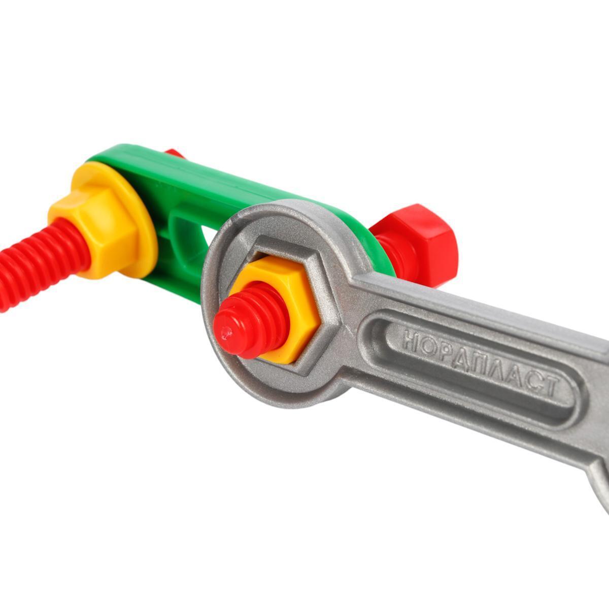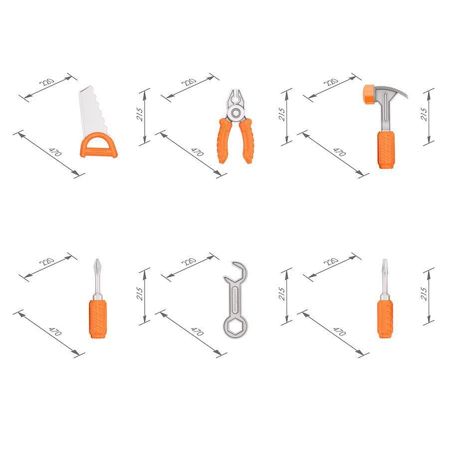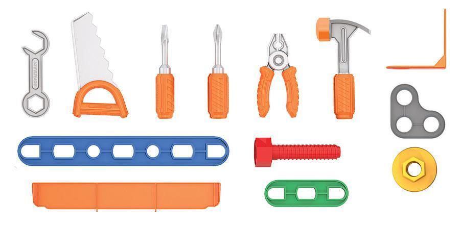 Подойдёт детям от 3 лет, которые только начинают осваивать простейшие инструменты. Внутри удобно сгруппированы плоскогубцы, две отвертки, молоток, гаечный ключ, пила и другие предметы – каждый элемент легко берётся маленькой рукой. Детям предлагается выполнять простые «ремонтные» задачи, а затем собрать самолёт, кран или лодку из конструкторских деталей.