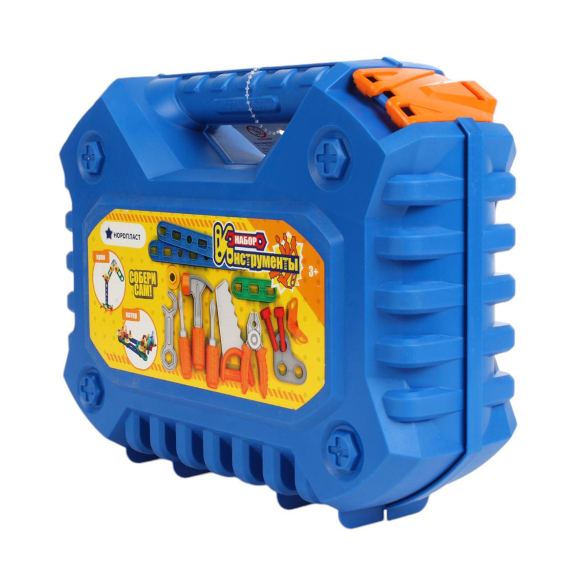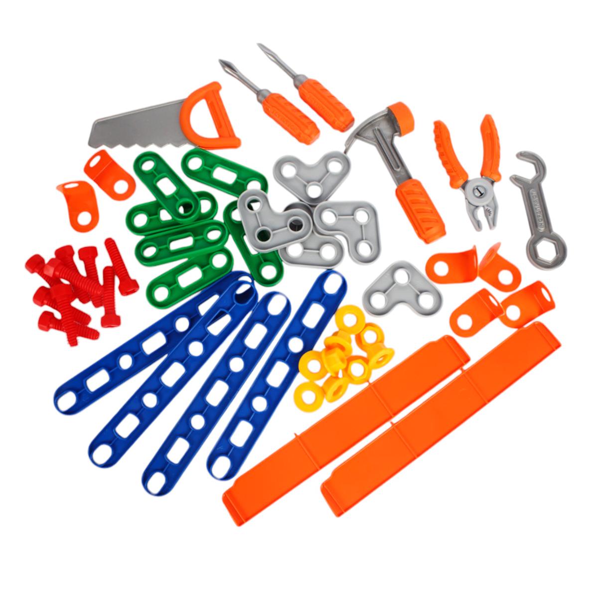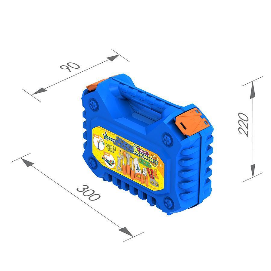 Размеры кейса – 30 × 22 × 9 см, удобно помещается в детскую комнату и в машину. В комплекте 47 элементов: инструменты, болты, гайки, планки, соединительные детали и более 20 фигурных деталей для сборки. Материал – лёгкий, но износостойкий пластик и безопасный металл в элементах, требующих прочности.