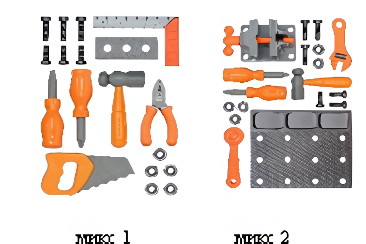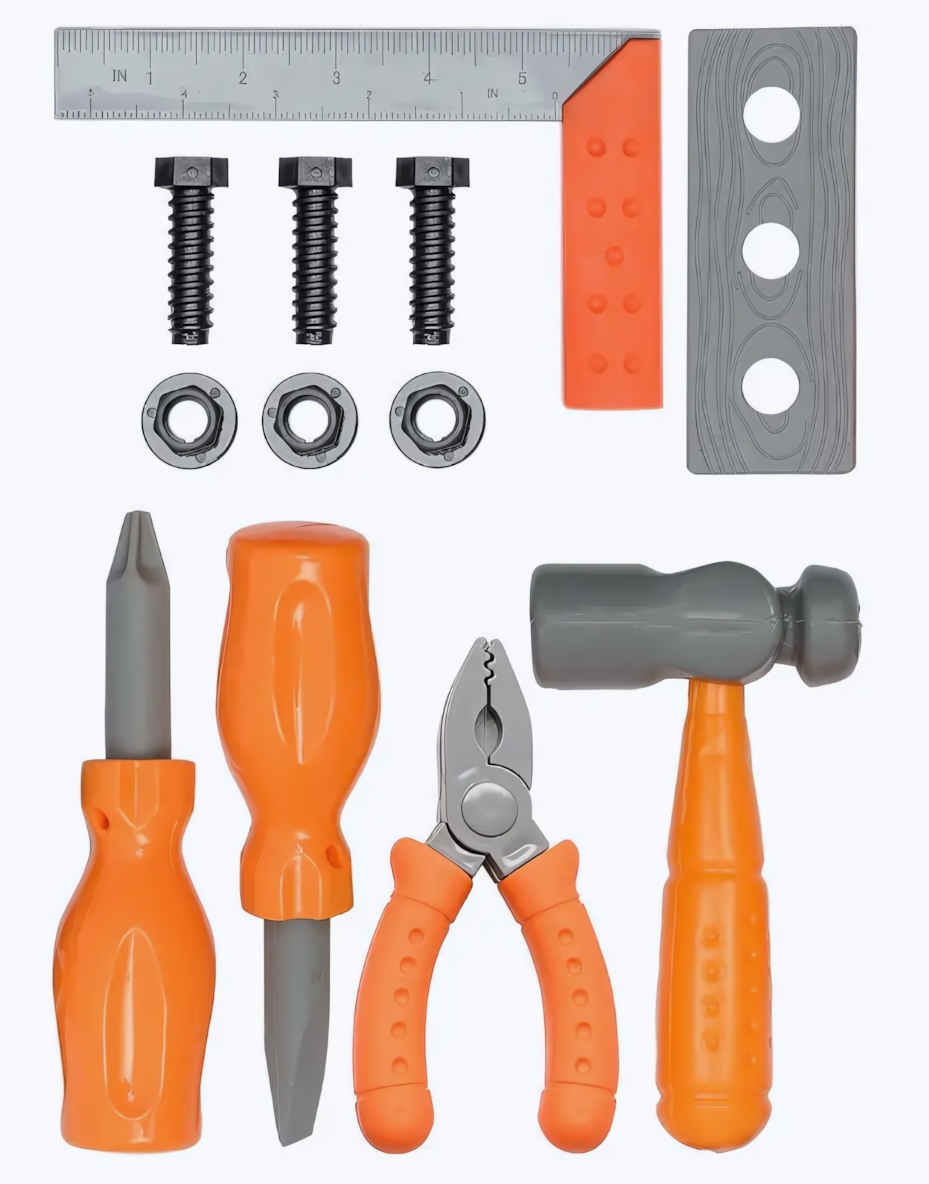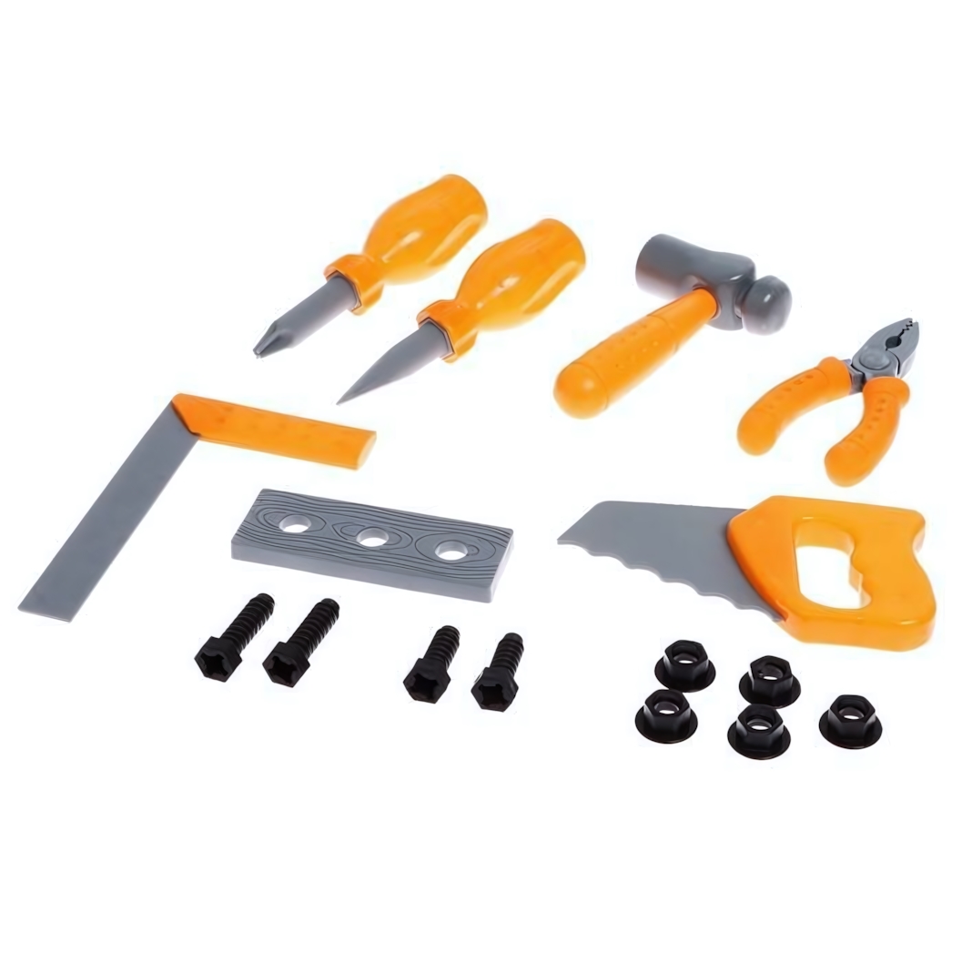 В набор входят 12 предметов, включая плоскогубцы, молоток, отвертки и другие инструменты, которые позволят вашему ребенку имитировать ремонтные работы и учиться основам работы с инструментами. Каждый элемент набора разработан с учетом детской безопасности и удобства использования.