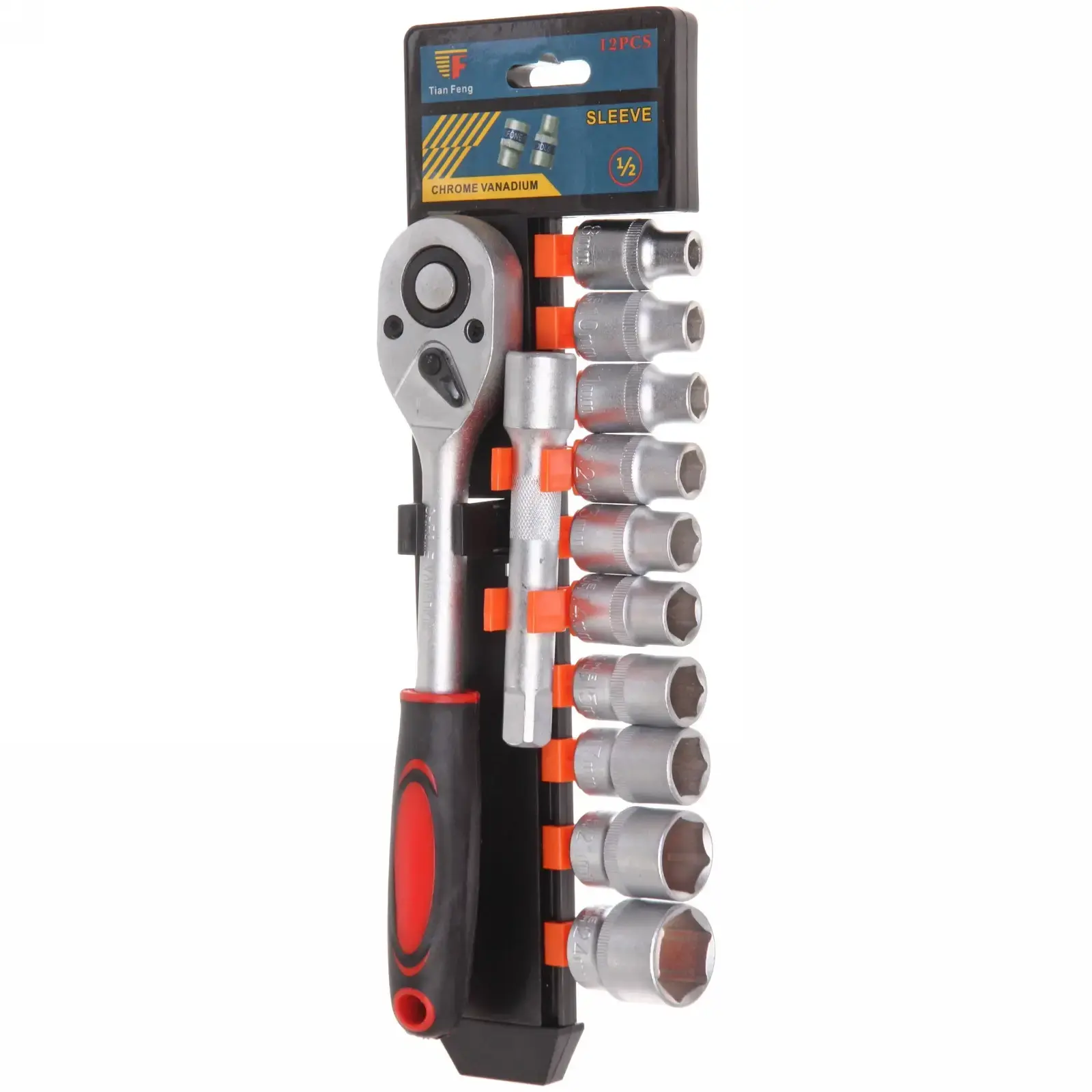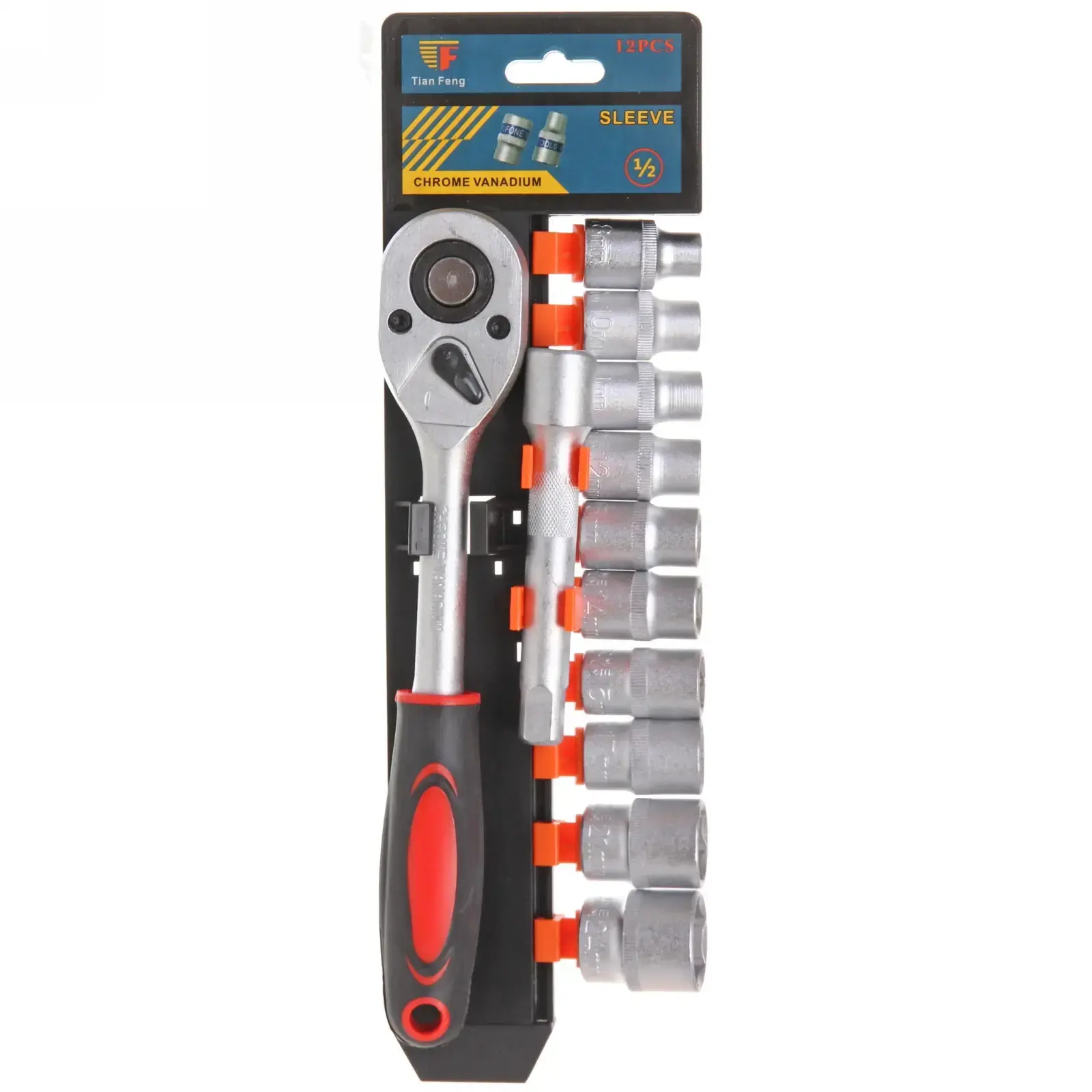 Компактная вертикальная упаковка с фиксаторами сохранит порядок в инструментах. Насадки надежно крепятся в оранжевых держателях — ничего не потеряется при транспортировке. Универсальный размер ½ дюйма подходит для большинства крепежей в автомобилях, мотоциклах и бытовой технике.