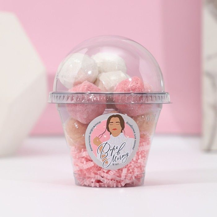 В наборе 11 бомбочек, каждая из которых весит 20 г. Они представлены в различных цветах: белом, розовом и персиковом, что делает их не только полезными, но и эстетически привлекательными. Контейнер выполнен из прозрачного пластика, что позволяет видеть содержимое и добавляет привлекательности вашему интерьеру.