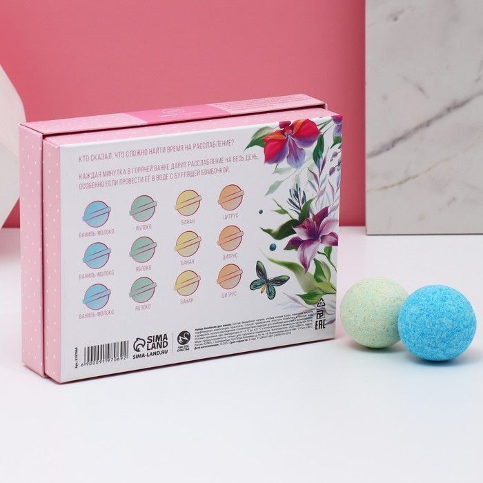 В наборе вы найдете 12 бомбочек, каждая из которых весит 40 грамм. Они упакованы в стильную коробку, оформленную в пастельных тонах с изображениями цветов и бабочек, что делает этот набор отличным подарком для близких. Не упустите возможность сделать свой уход за собой более приятным и эффективным!